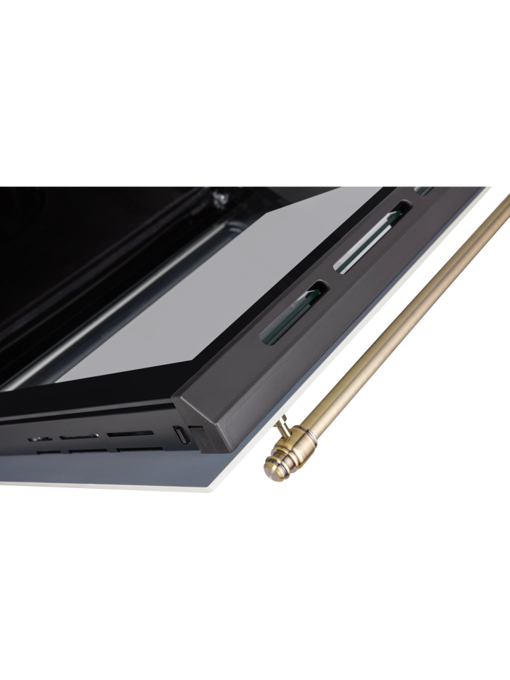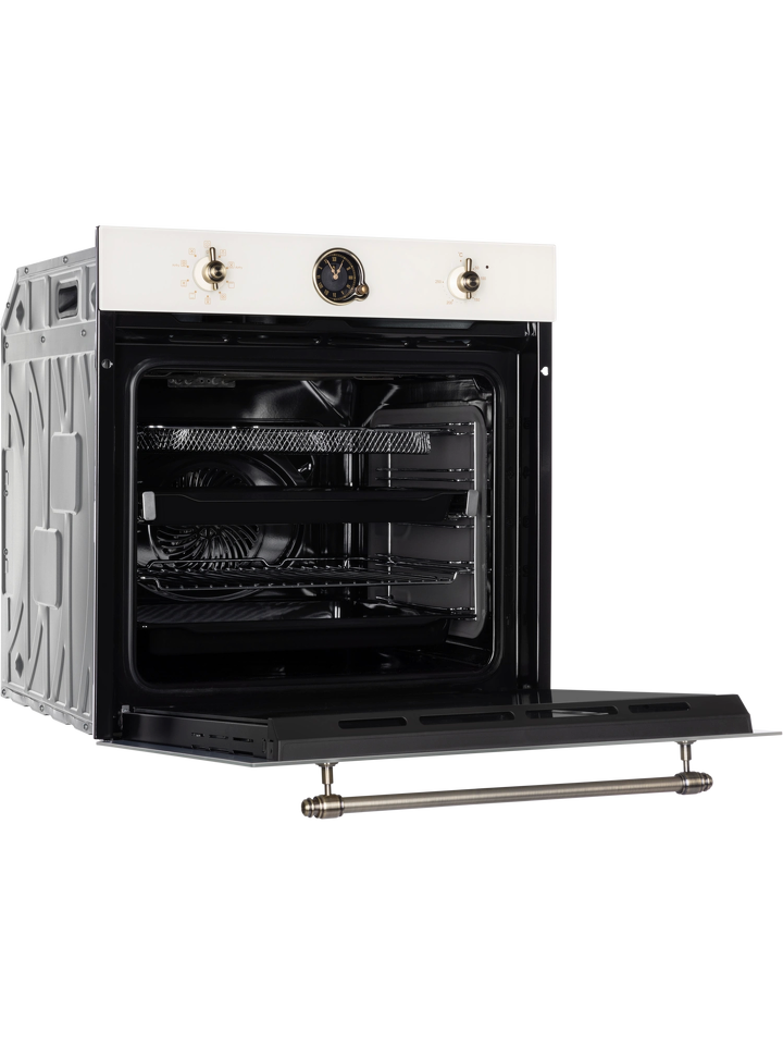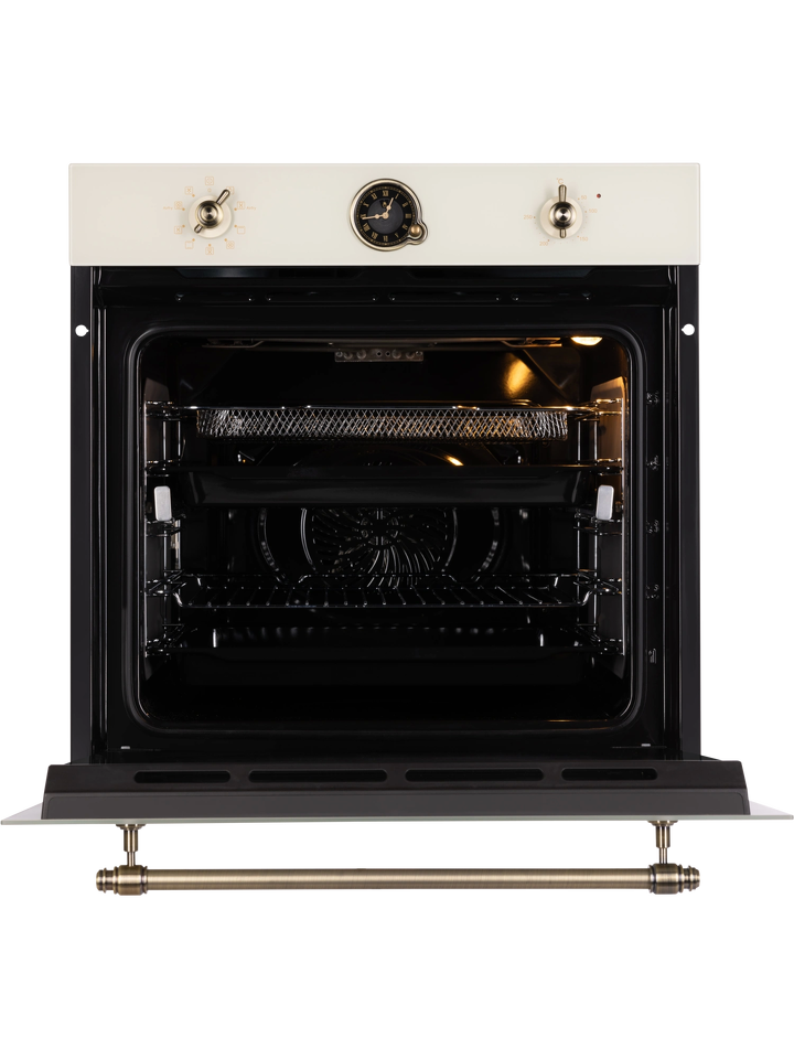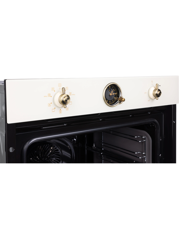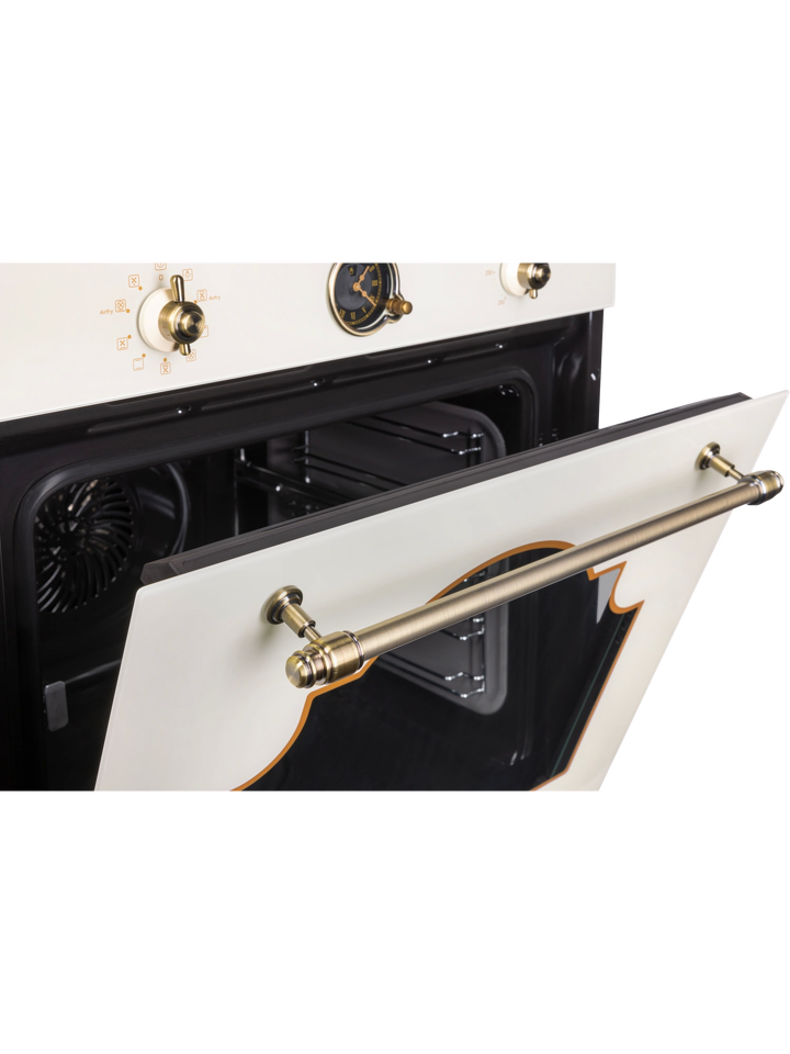Изысканное исполнение духового шкафа бежевого цвета позволит сделать его аутентичным дополнением кухонных пространств, созданных в стиле классика, винтаж или прованс. Модель с механической панелью управления дополнена декоративными поворотными переключателями и ручкой дверцы в цвете состаренной латуни.