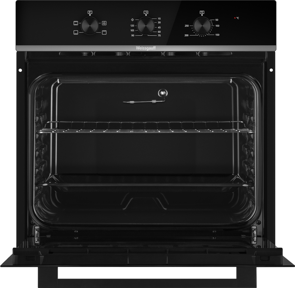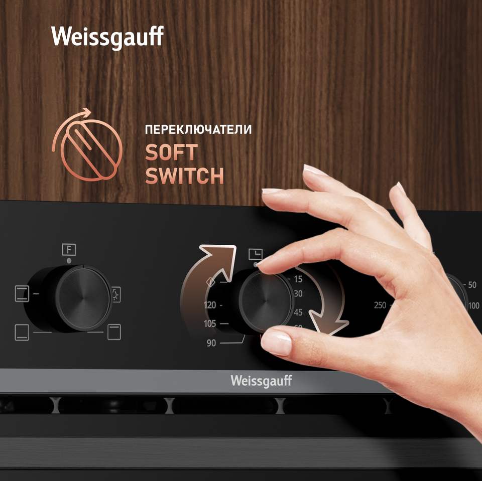 Электрический духовой шкаф от Weissgauff, выполненный в чёрном цвете, оснащённый механическими поворотными рукоятками Soft Switch, двойным остеклением дверцы и 4 режимами, буквально олицетворяет собой уверенность в надёжном и функциональном оснащении вашей кухни!