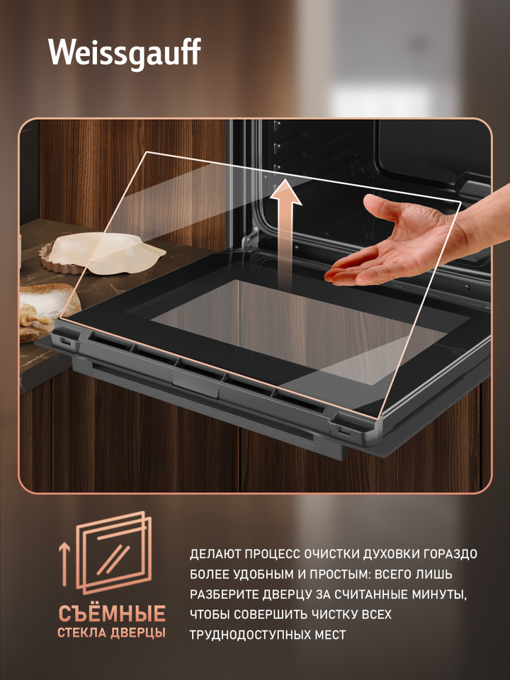 • Съемная дверца, делает процесс очистки духовки гораздо более удобным и простым: всего лишь снимите дверцу за считанные минуты, чтобы совершить чистку всех труднодоступных мест, вернув облику вашего духового шкафа первозданную чистоту.
