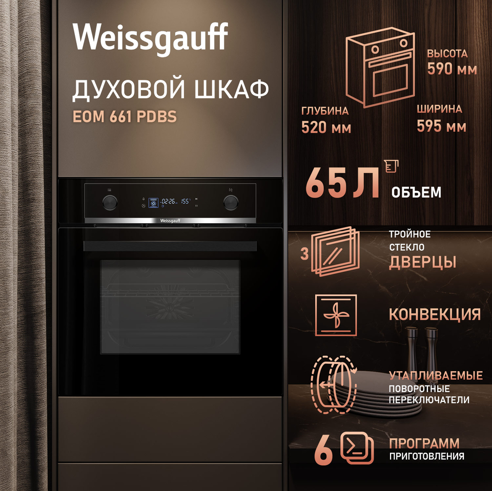 Дизайн в черном цвете - станет финальным штрихом в совершенстве облика этой модели. Каждый раз, взаимодействуя с духовым шкафом от Weissgauff, вы будете в полной мере ощущать, как он способен нагревать не только еду, но и согревать душу, став настоящим сердцем вашего уютного домашнего очага