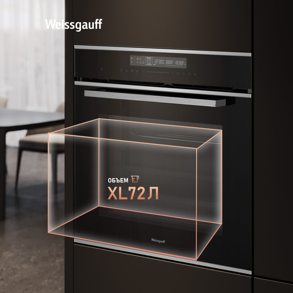 Объем XL 72 литра дает вам полную уверенность в том, что приобретая этот духовой шкаф, вы сможете разместить в нем сразу весь необходимый объем пищи, и даже профессионально работать на нескольких уровнях одновременно, порадовав себя и своих близких настоящим пиром, приготовленным в духовом шкафу Weissgauff на действительно ресторанном уровне.