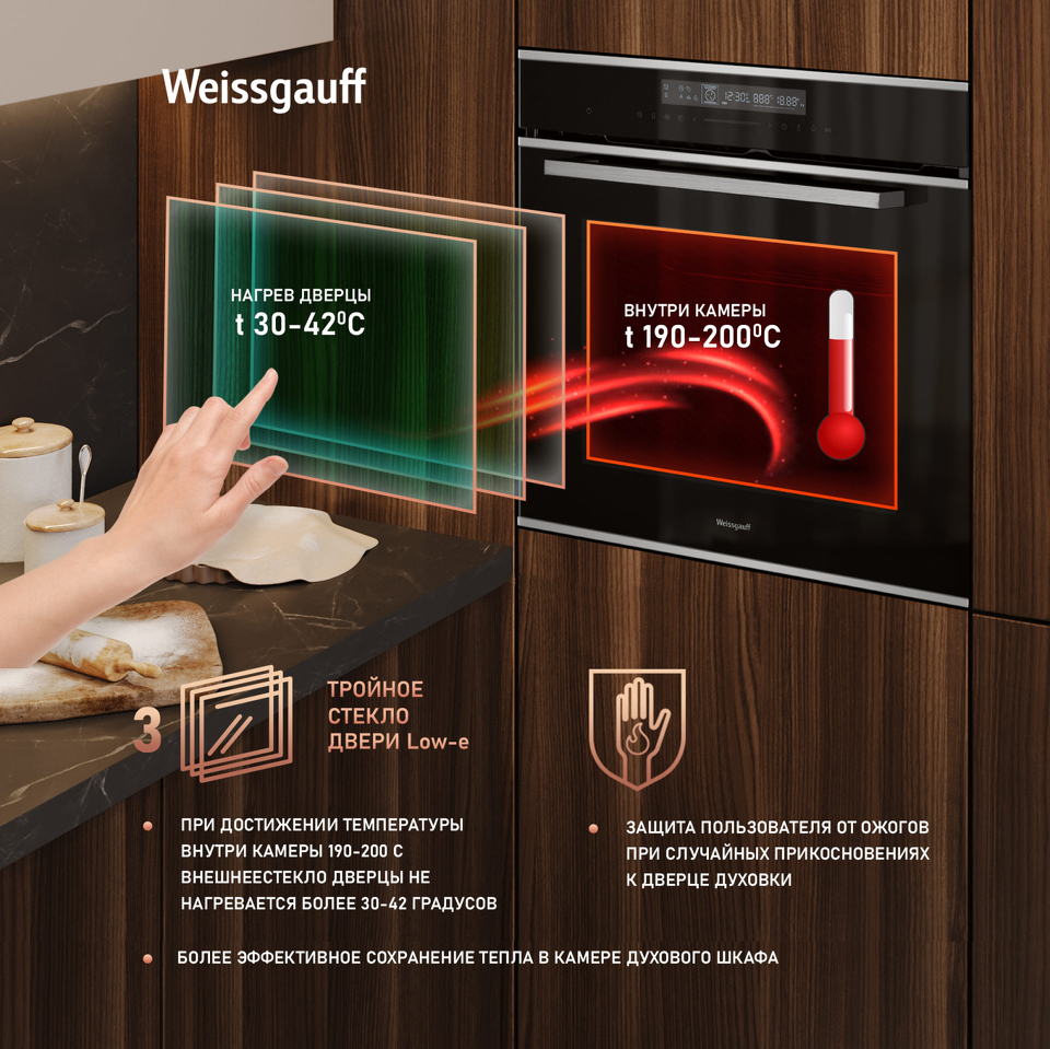 Тройное стекло дверцы с технологией защиты от нагрева LOW E предотвращает нагрев стекла духовки до температуры больше 30-42 градусов в течение часа после того, как вы включите духовку. При этом внутри духовки температура может достигать 190-200 градусов. Многослойное стекло с отражающим покрытием остается холодным, снижая риск ожога. Это повышает безопасность, особенно для детей и домашних питомцев. Weissgauff делает бытовую технику удобной и безопасной!