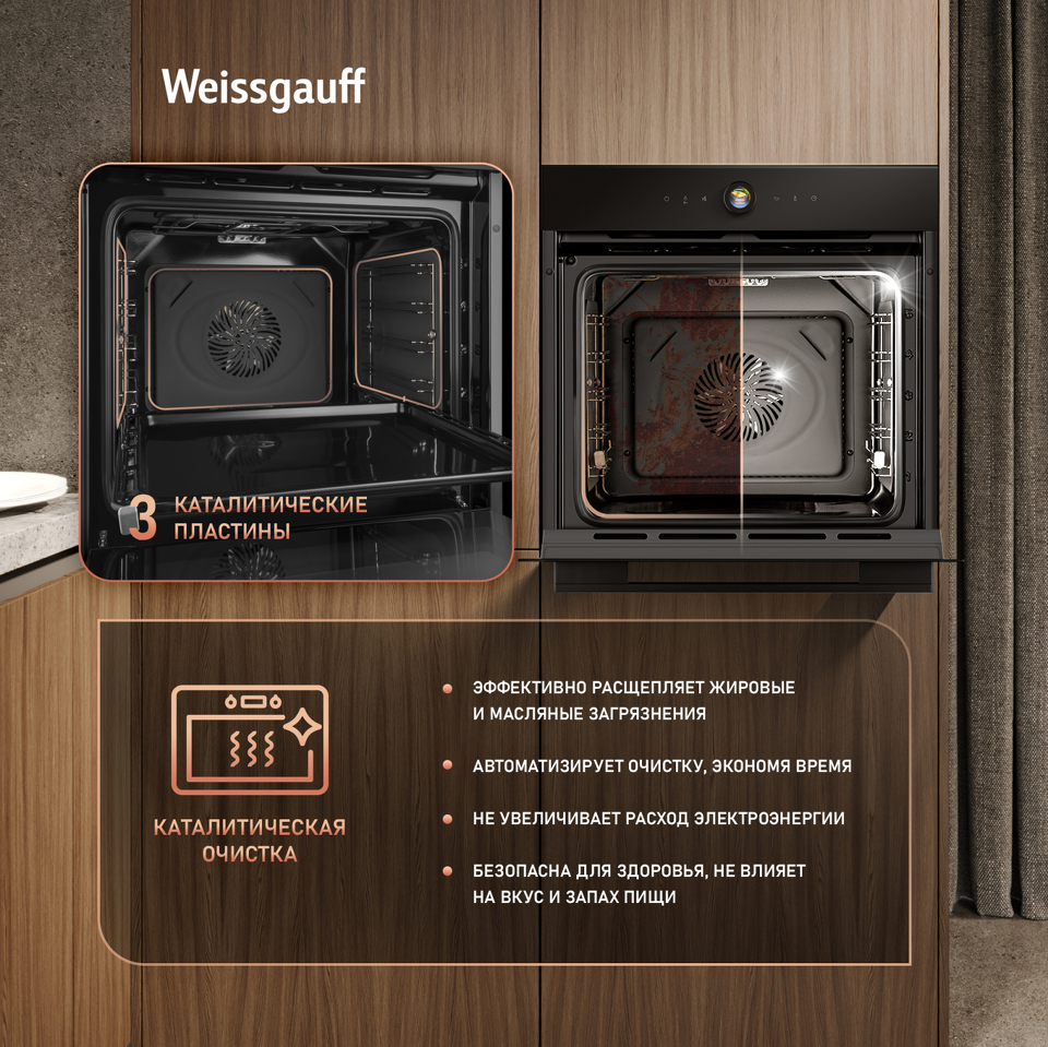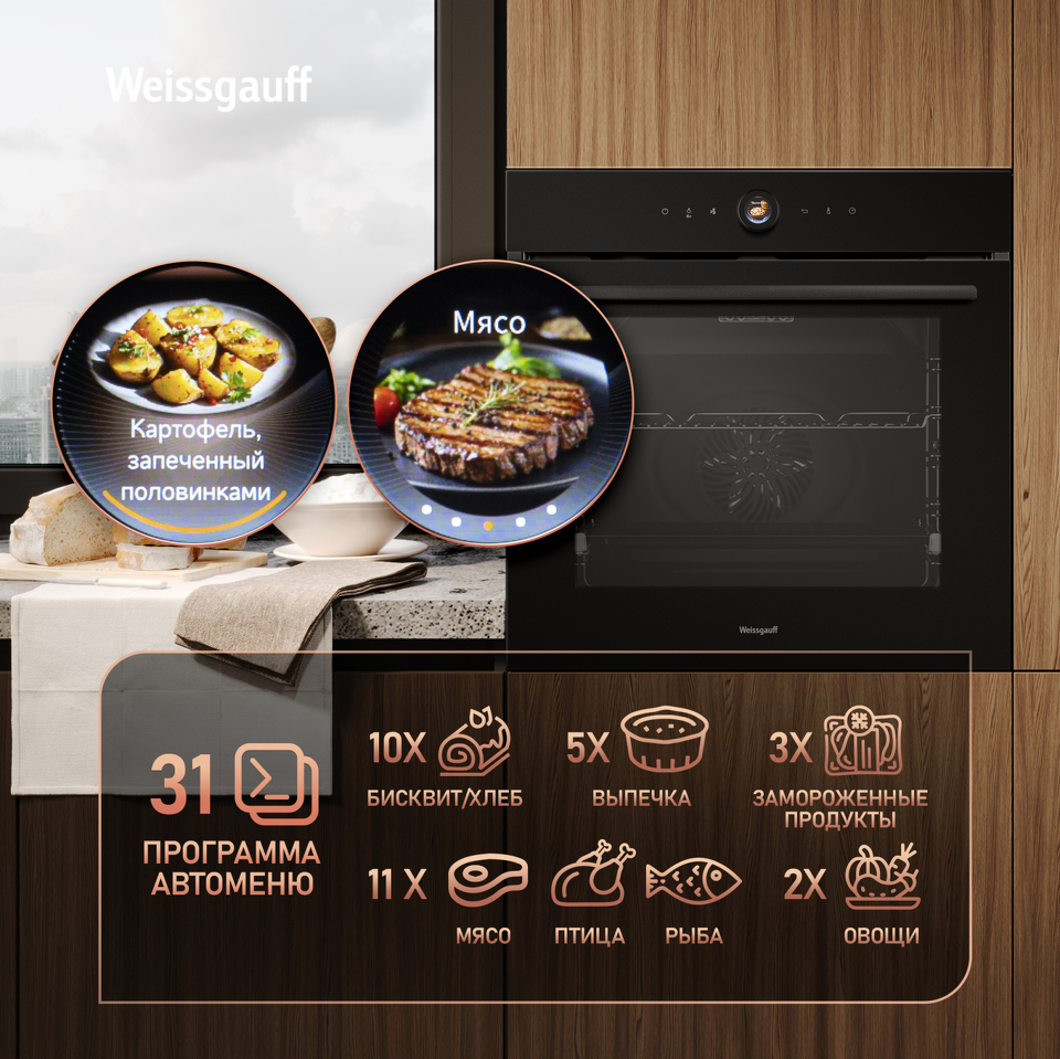Новое поколение электрических духовых шкафов от Weissgauff представлено моделью, выполненной из черного матового закаленного стекла. Устройство оснащено современным цветным дисплеем и сенсорным управлением, что отражает приверженность компании к высокому уровню качества и вниманию к деталям. Многофункциональный духовой шкаф является не только функциональным приобретением для кухонного пространства, но и эстетически привлекательным элементом интерьера, подчеркивающим безупречный вкус и стиль владельца!