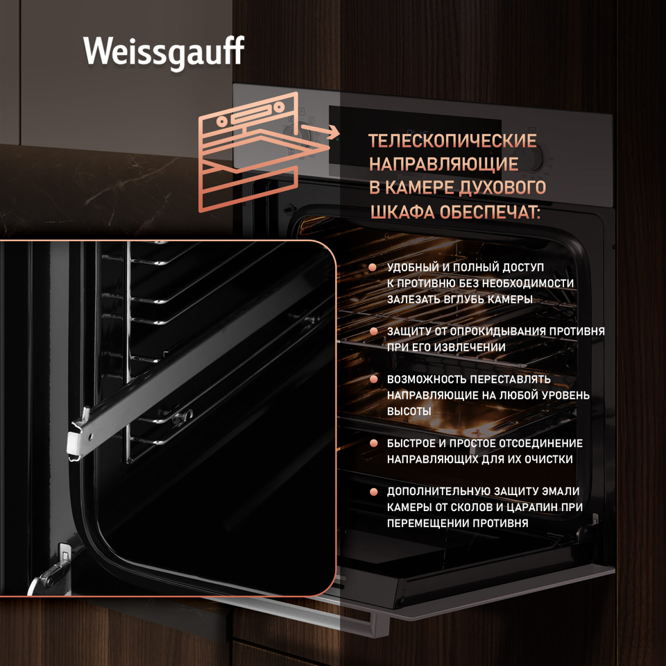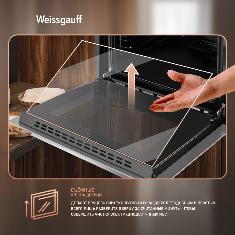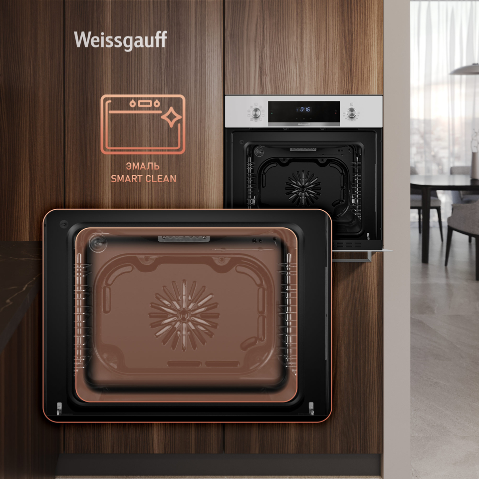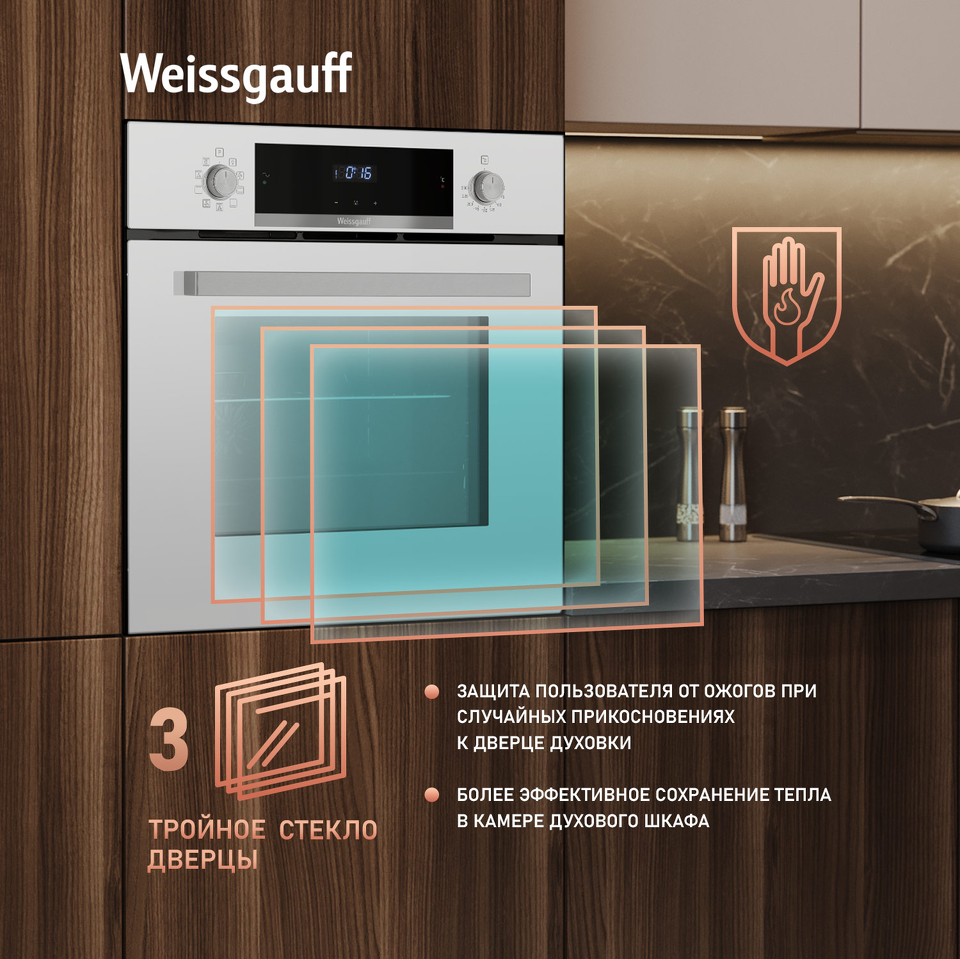 Тройное стекло дверцы, воплощающее в себе весь подход к безопасности и термозащите, который Weissgauff реализовали в данной модели. Теперь случайные прикосновения к дверце духового шкафа во время процесса приготовления еды больше будут не страшны, ведь мы позаботились о том, чтобы фронтальная сторона духового шкафа никогда не нагревалась до опасных температур.