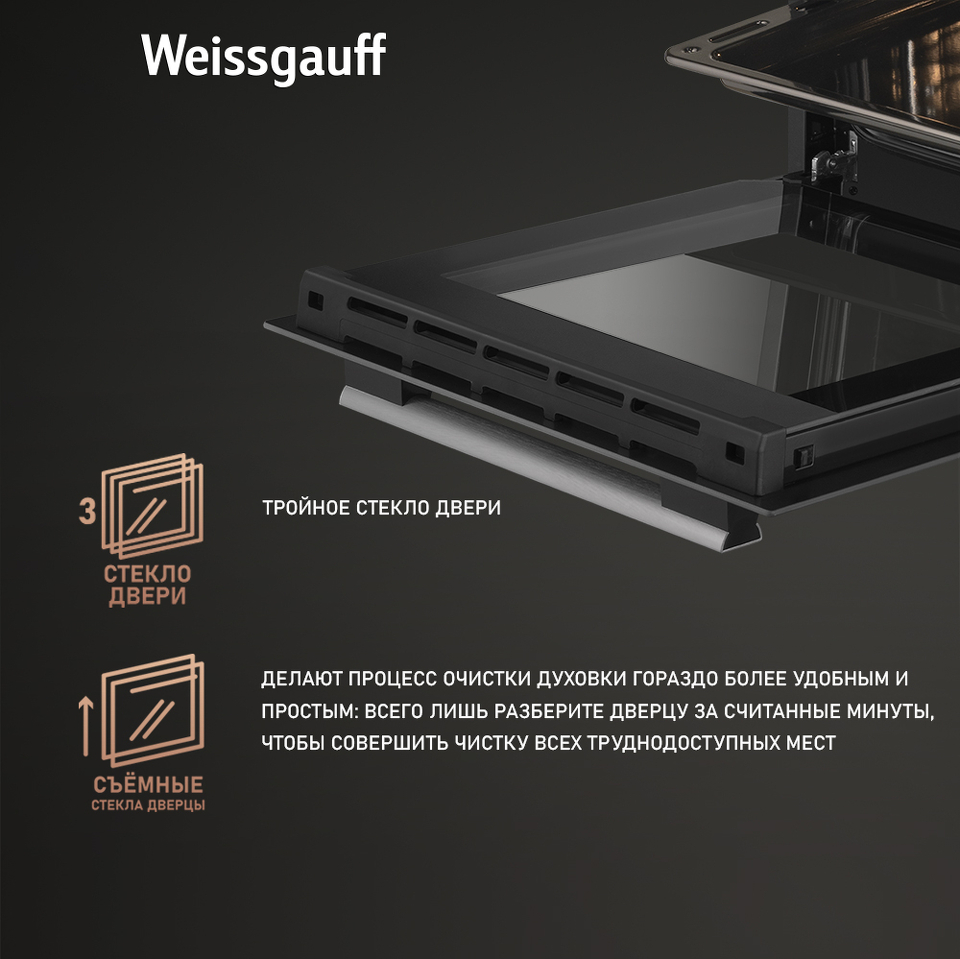 Тройное стекло дверцы, воплощающее в себе весь подход к безопасности и термозащите, который Weissgauff реализовали в данной модели. Такое стекло обеспечивает вам значительно большую степень защиты при случайных прикосновениях к нагревающейся дверце плиты, чем в моделях, не оснащенных технологией многослойного стекла. Для нас в Weissgauff важно, чтобы работа с бытовой техникой была не только приятной, но и безопасной!
