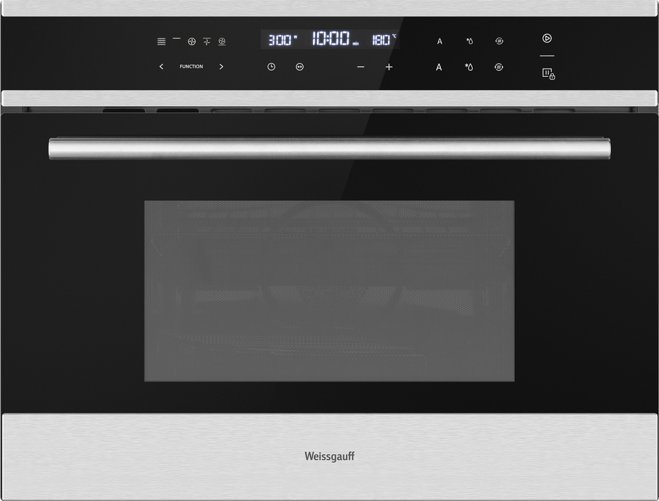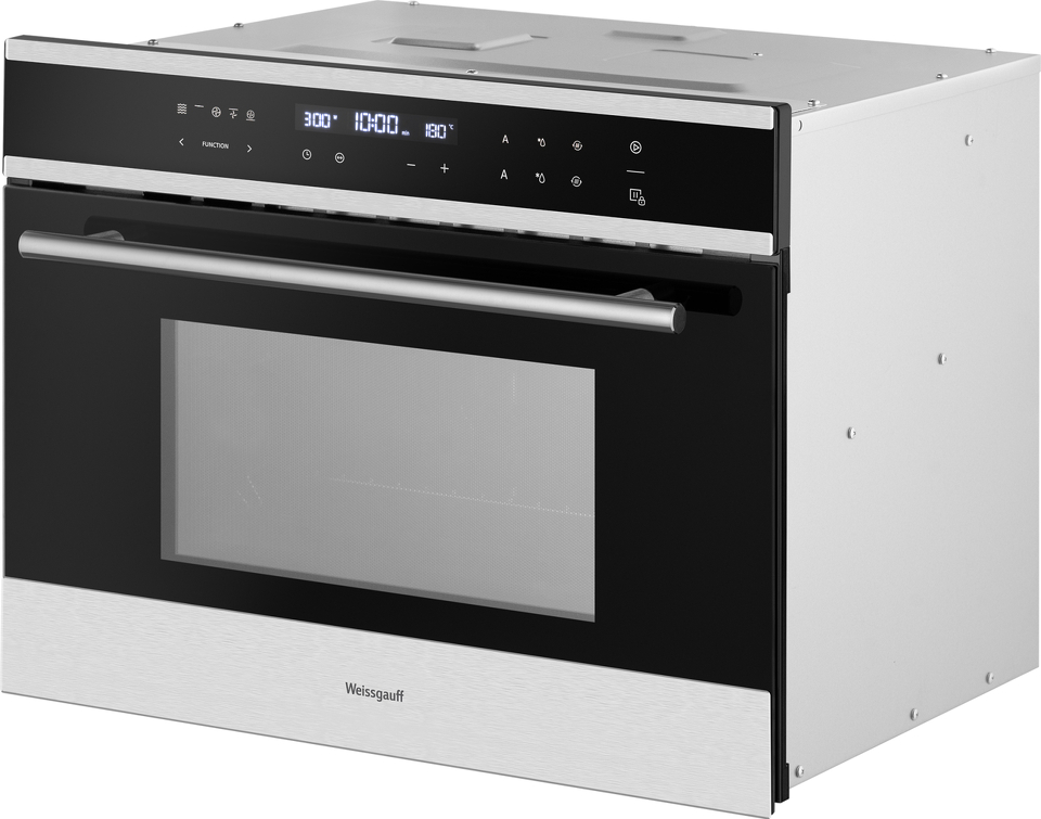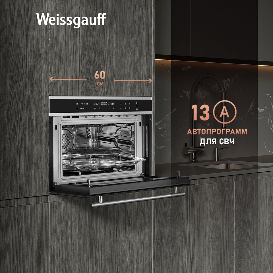 Компактный духовой шкаф с функцией СВЧ от Weissgauff, выполненный в чёрном стекле со вставками из нержавеющей стали - это функционал сразу двух полноценных устройств, воплощённый в одной модели.