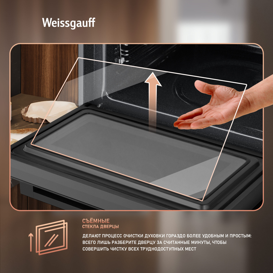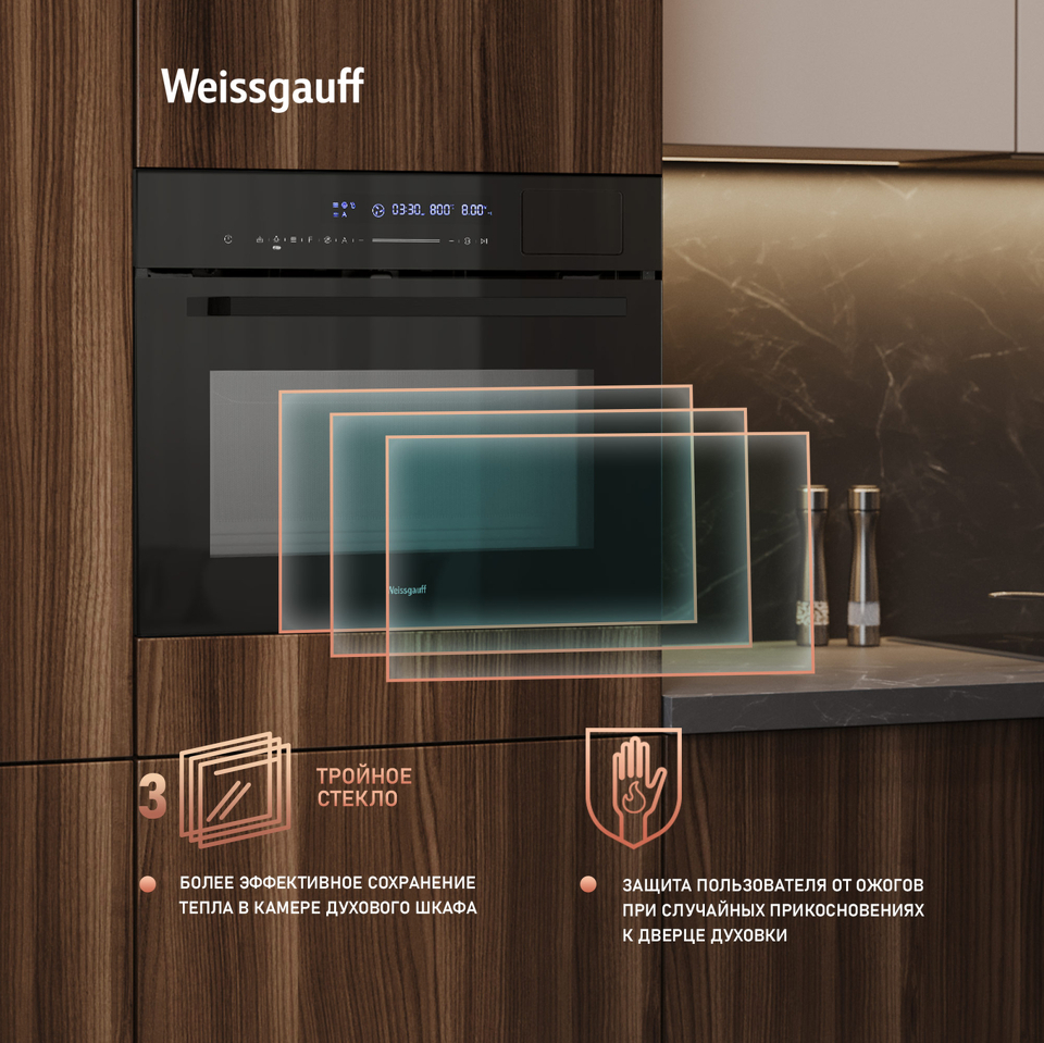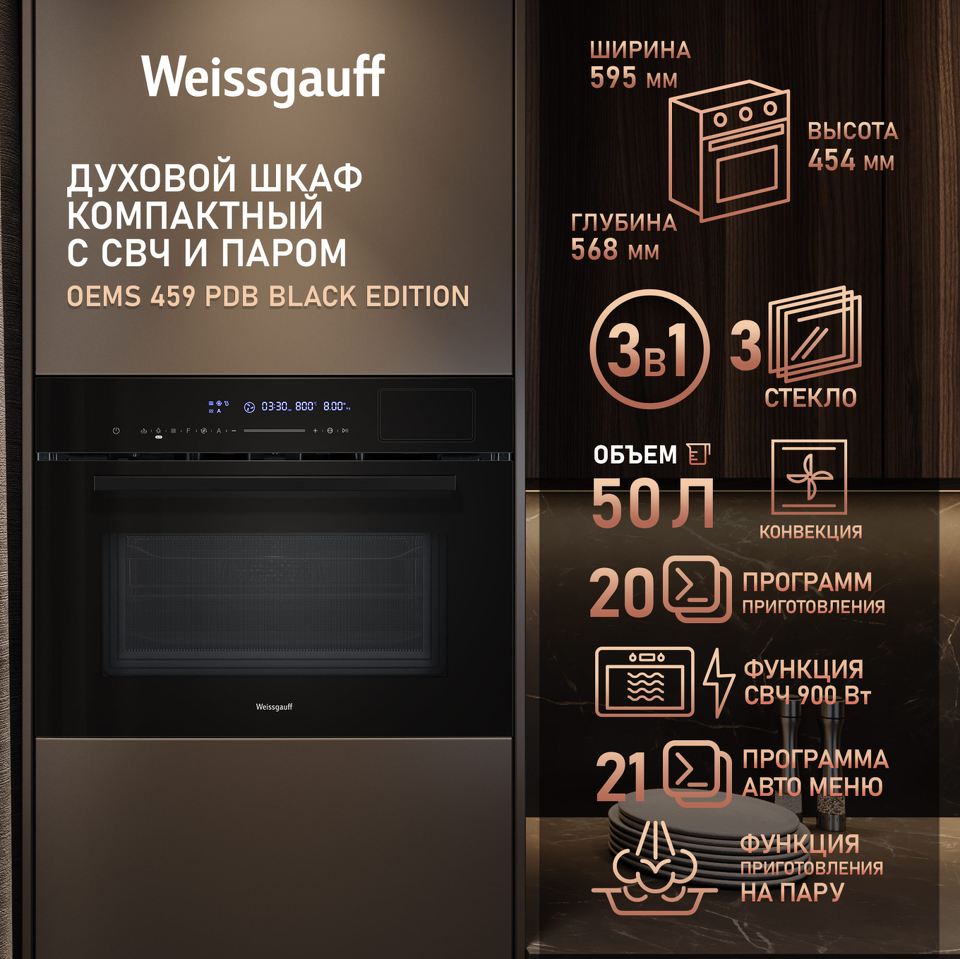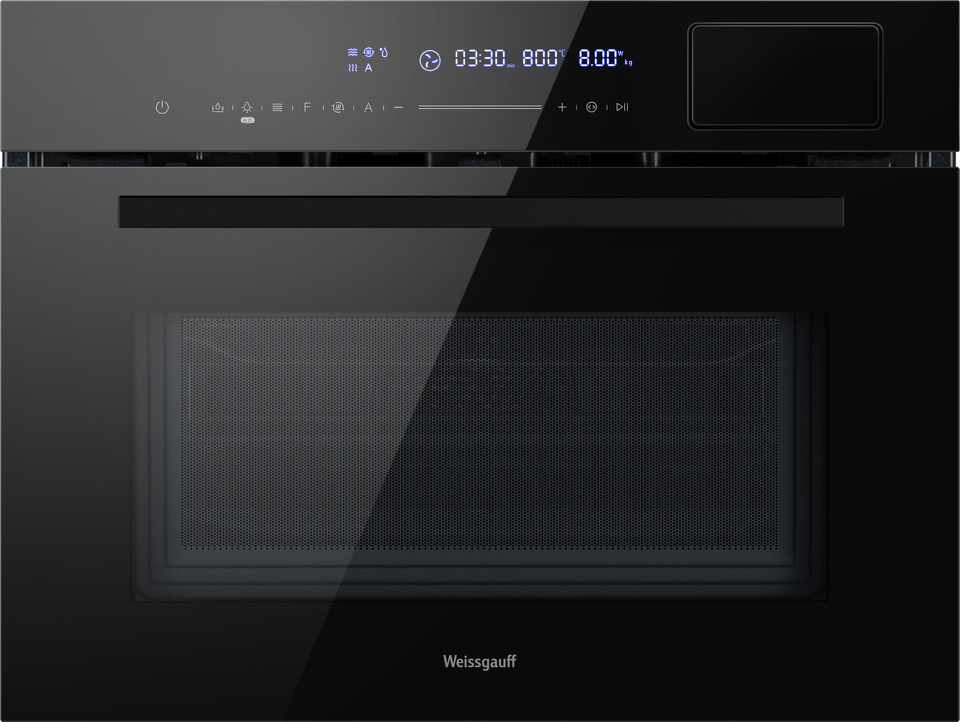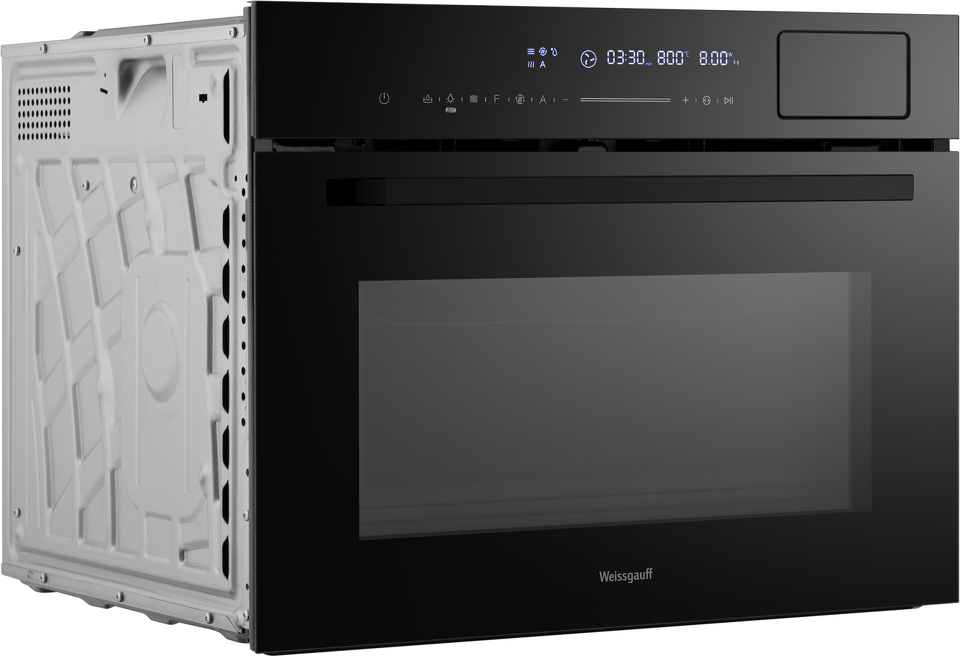 С новым поколением духовых шкафов Weissgauff выходит на запредельно высокий уровень качества! Новая модель сочетает в себе инновационную технологию приготовления еды на пару и СВЧ с классическими функциями электрического духового шкафа, включая гриль, конвекцию и традиционный нагрев! Компактный встраиваемый духовой шкаф от Weissgauff с функцией пара и СВЧ без поворотного стола, воплощенная в дизайне Black Edition- это невероятное сочетание сразу трёх отдельных устройств,воплощённое в одной модели!