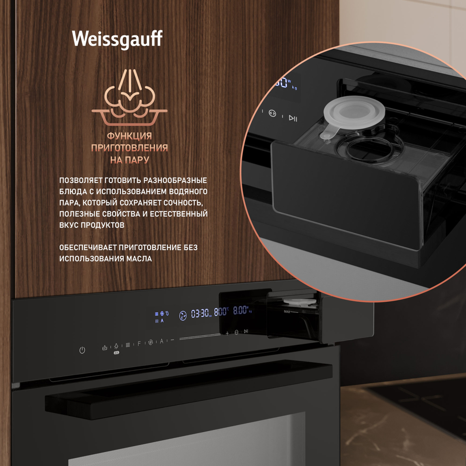 Приготовление на пару это прекрасная возможность получить не только вкусную, но и полезную еду, всего лишь добавив воду в специальный резервуар и выставив соответствующую опцию на панели управления! Паровые котлеты из курицы и индейки, гарниры и овощи без использования масла, а также рыба и мясо на пару, исполненные на ресторанном уровне прямо у вас дома - теперь всё это становится реальностью с новым духовым шкафом от Weissgauff!