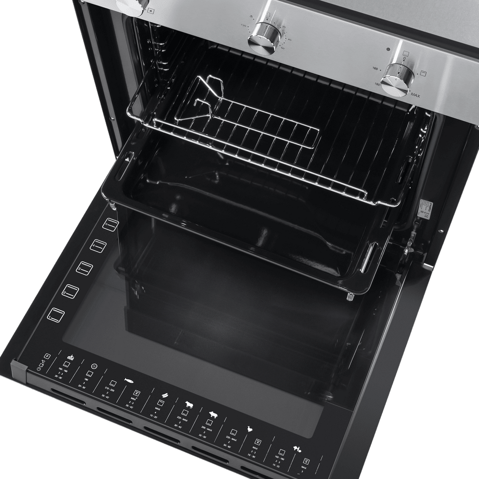 Механическое управление осуществляется цельнометаллическими поворотными ручками. Можно выставить температуру готовки, установить таймер (0-60 мин) и выбрать один из 4 режимов работы: нижний газовый нагрев с вентилятором, традиционная готовка, газовый гриль, вентилятор, освещение. Данная модель работает как при открытом, так и при закрытом гриле.