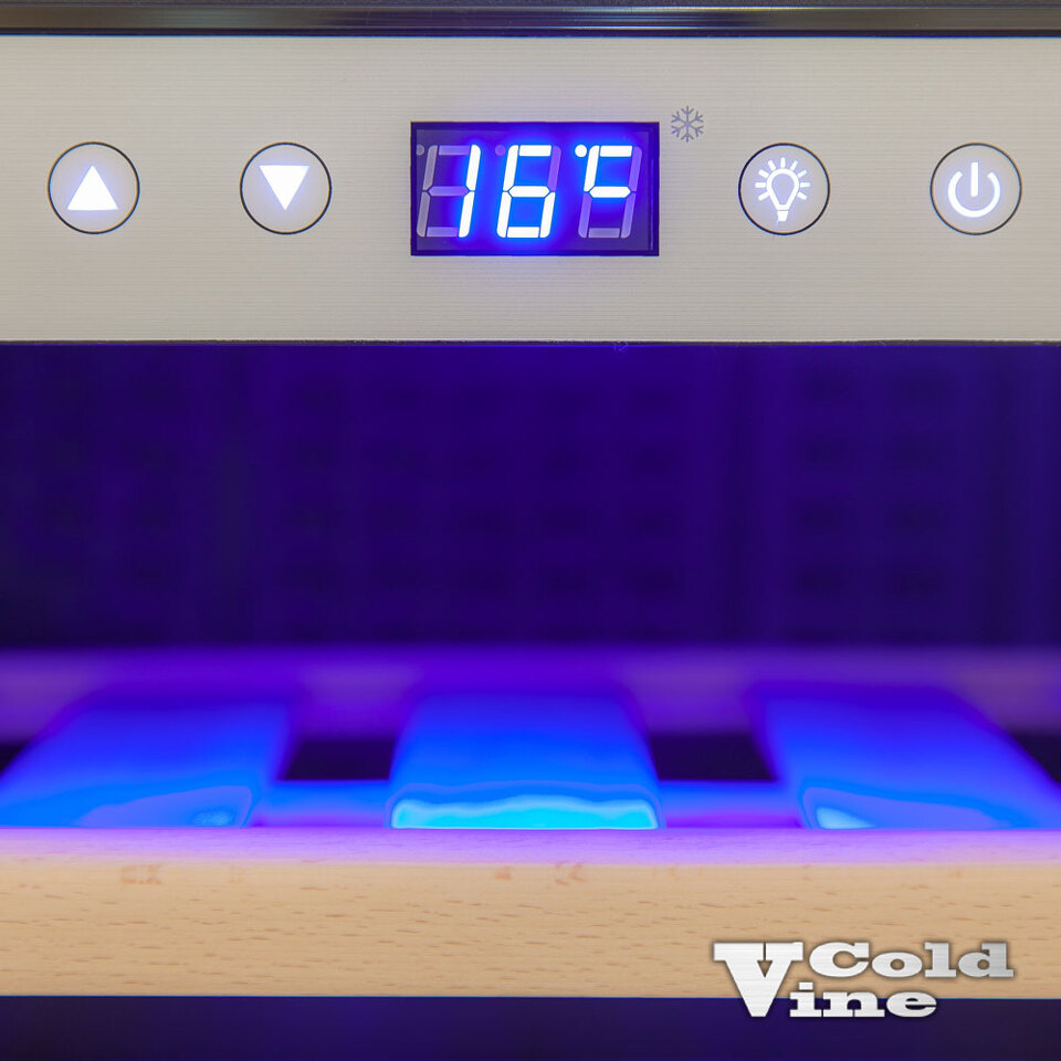 Внутри винного шкафа в тон стальной раме находится сенсорная панель управления серебристого цвета, на которой можно включить винный холодильник, установить нужную Вам температуру для хранения необходимого сорта вин, а также включить мягкую светодиодную подстветку голубого цвета.