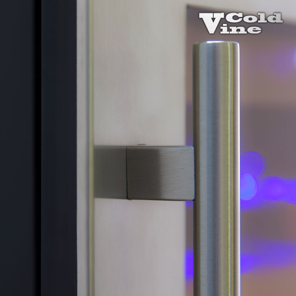 Корпус винного холодильника изготовлен из стали, окрашенной в чёрный цвет. Дверь выполнена из тонированного стеклопакета с защитой от УФ-излучения со стальной рамой по периметру. Стильный внешний вид винного шкафа дополняет изящная стальная ручка. В сегменте встраиваемых винных шкафов Cold Vine есть аналогичная по вместительности и габаритам модель C18-KBB1, отличающаяся только чёрной рамой двери.