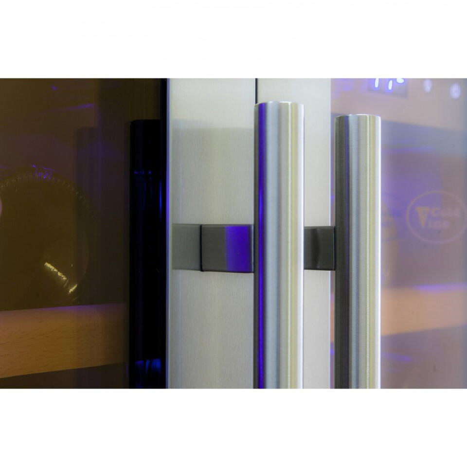 Винный шкаф C30-KST2 отличается от всей линейки винных шкафов Cold Vine своим неповторимым дизайном и функциональными особенностями. Внутреннее пространство винного шкафа разделено на две вертикальные зоны, каждая из которых имеет свою собственную дверь и систему управления. В каждой из температурных зон можно отдельно включить питание, установить требуемую температуру хранения вина от +3 до +22 ˚С и включить мягкую светодиодную подсветку синего цвета. Корпус винного шкафа выполнен из металла, окрашенного в чёрный цвет. Двери изготовлены из двойного тонированного стекла с защитой от УФ-лучей и обрамлены стальной рамой по периметру, что придаёт винному шкафу свой неповторимый стиль. В комплекте к шкафу идут две стальные ручки, в тон раме.