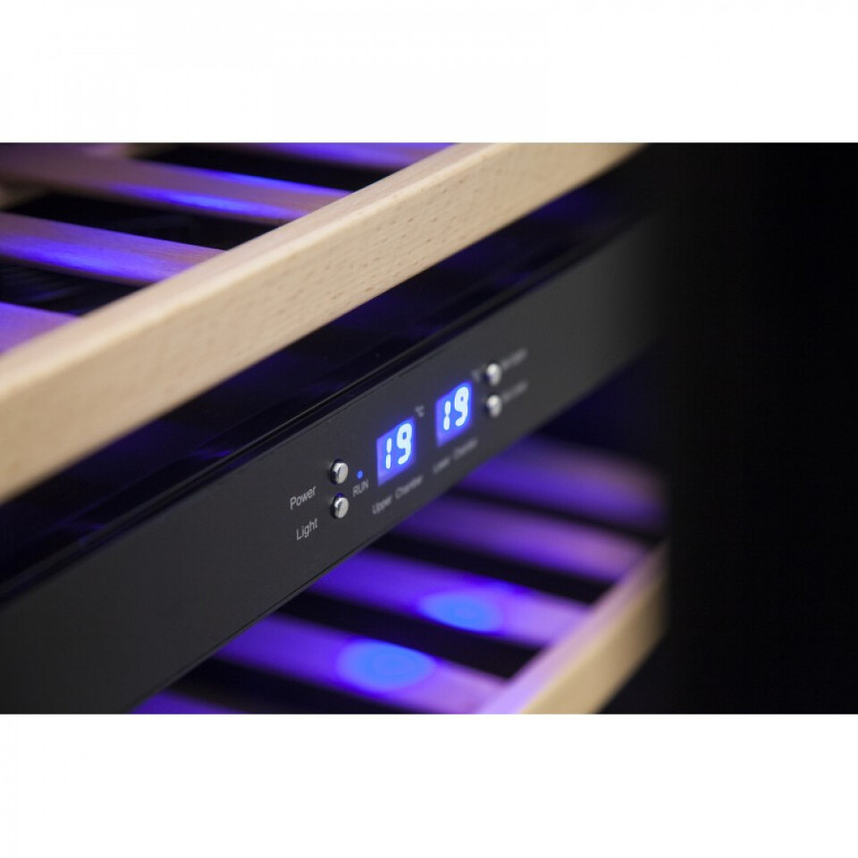 Регулируемый температурный режим каждой зоны шкафа в диапазоне от +5°C до +18°C позволяет хранить белые, красные и игристые вина.