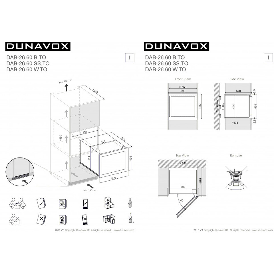 Винный шкаф Dunavox DAB-26.60W.TOпредназначен для встраивания в нишу. Для обеспечения отвода горячего воздуха необходимо предусмотреть сквозную вентиляционную нишу площадью не менее 200 см² от цоколя до верхней части мебельного модуля.