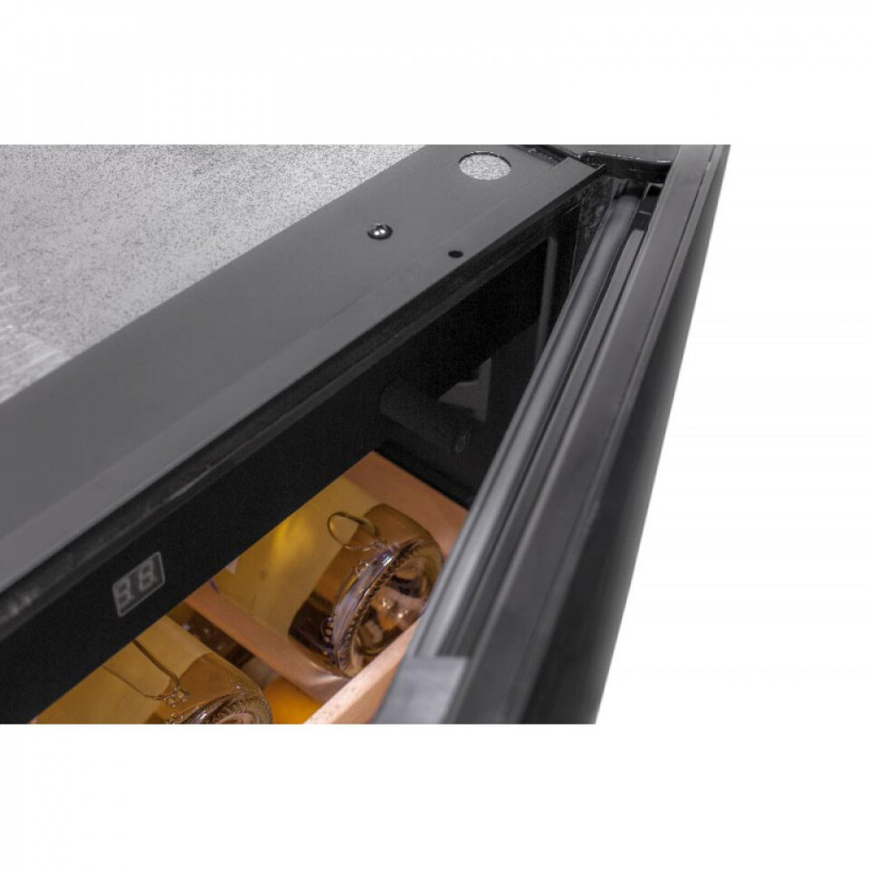 Корпус модели металлический с покрытием черного цвета, дверца выполнена из прозрачного двойного стеклопакета, защищенного от воздействия ультрафиолетовых лучей. Цифровой индикатор температуры и внутреннее освещение на светодиодах синего цвета.