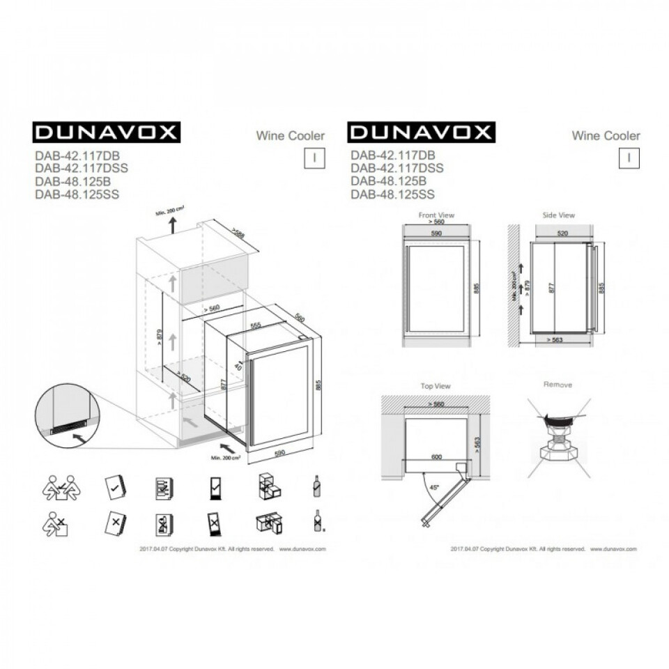 Винный холодильник Dunavox DAB-42.117DB с вместительной холодильной камерой станет отличным выбором для кухни или небольшого ресторана. Двузонная модель DAB-42.117DB оснащена внутренним вентилятором для равномерного распределения холодного воздуха ко всем полкам шкафа, угольным фильтром и нагревательным элементом. Комплектуется холодильник DAB-42.117DB шестью деревянными полками. В нем предусмотрена возможность перевешивания двери на другую сторону, что дает дополнительное удобство при установке холодильника в подходящее по габаритам место.Шкаф оснащен электронной панелью управления, с помощью которой пользователь выбирает необходимый температурный режим работы аппарата. Элегантный внешний вид винного холодильника DAB-42.117DB подойдет как к интерьеру современной кухни, так и обстановке небольшого ресторана. Корпус изготовлен из металла с покрытием черного цвета, дверца оснащена тонированным стеклом, защищенным от воздействия ультрафиолетовых лучей. Ручка шкафа удобная, накладная, выполнена полностью из металла. Цифровой индикатор температуры и внутреннее освещение - на светодиодах синего цвета.Основные характеристики моделиКомпрессорная система охлажденияТихая работаВместительностьКачественные материалы всех деталейУдобное управлениеДве зоны охлажденияШирокий диапазон температурВстраиваемыйВнутренняя подсветкаГарантия 3 года со дня приобретенияОтличительные особенностиЦиркуляция воздуха (внутри встроенные вентиляторы)Конденсатор на задней внешней стенке шкафа (характерно для всех встраиваемых в колонну моделей). Встраивать можно вплотную по корпусу шкафа, т.к. теплоотдача идёт только сзади, и именно поэтому сзади нужно оставлять достаточно пространства для оттока тёплого и притока холодного воздухаСтекло двери двойное с тонировкой и защитой от УФ-излученияКласс энергопотребления А (всего 146 kWh/annum)Заявленный производителем уровень шума 45 dB. Но по факту шуметь они будут меньше, т.к. это встройкаПолки деревянные нелакированные на метабоксах. Отличительная особенность: самая верхняя полка имеет специальные вкладки для поперечного расположения бутылок большого размера типа Магнум. (фото во вложении)Дверь можно перенавесить на другую сторону открыванияВ комплекте есть пластиковая ванночка для воды(для поддержания оптимальной влажности внутри винного шкафа)Голубая светодиодная подсветкаКлиматический класс N(+16/+32˚С)
