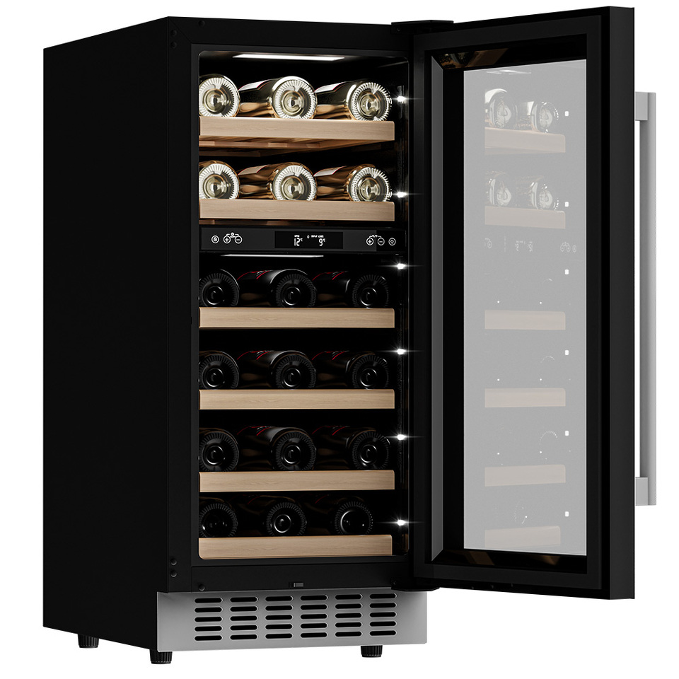 Компрессорный винный шкаф Meyvel MV28-KWT2 обладает большой вместимостью и даёт возможность разместить до 28 бутылок стандартного типа Бордо (0,75 л). Располагаются они на выдвижных полках из дерева. Внутреннее пространство шкафа разделено на 2 температурные зоны, с возможностью настраивать каждую из них. Общий диапазон температуры у данной модели от +5°C до +20°C.