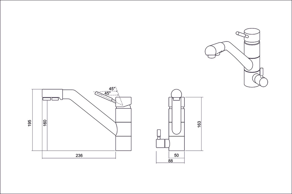 Кухонный смеситель с возможностью подключения фильтра для очистки воды. Фильтрованная вода подается отдельной ручкой через отдельную трубку и не смешивается с водопроводной водой. Однорычажное управление поможет легко регулировать температуру и напор подачи воды. Соответствует стандартам DIN DVGW.