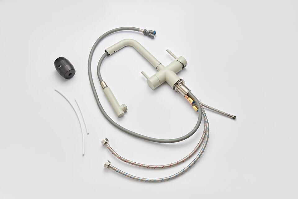 Кухонный смеситель с возможностью подключения фильтра для очистки воды. Фильтрованная вода подается отдельной ручкой через отдельную трубку и не смешивается с водопроводной водой.