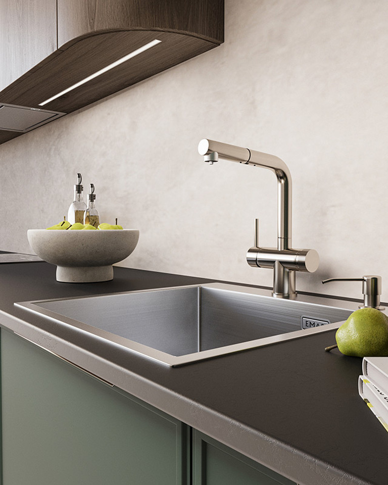 Однорычажное управление поможет легко регулировать температуру и напор подачи воды. Выдвижной излив увеличивает площадь и эффективность использования смесителя. Соответствует стандартам DIN DVGW.