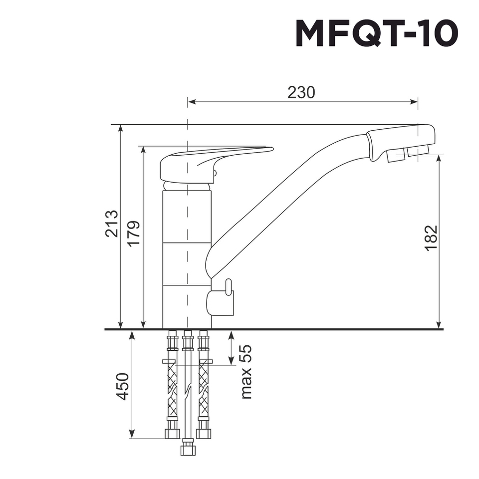 Реализован тройной подвод воды через один излив: холодная, горячая и фильтрованная. Переход с одного подвода на другой производится поворотом рычага. Набор для соединения с фильтром входит в комплект.