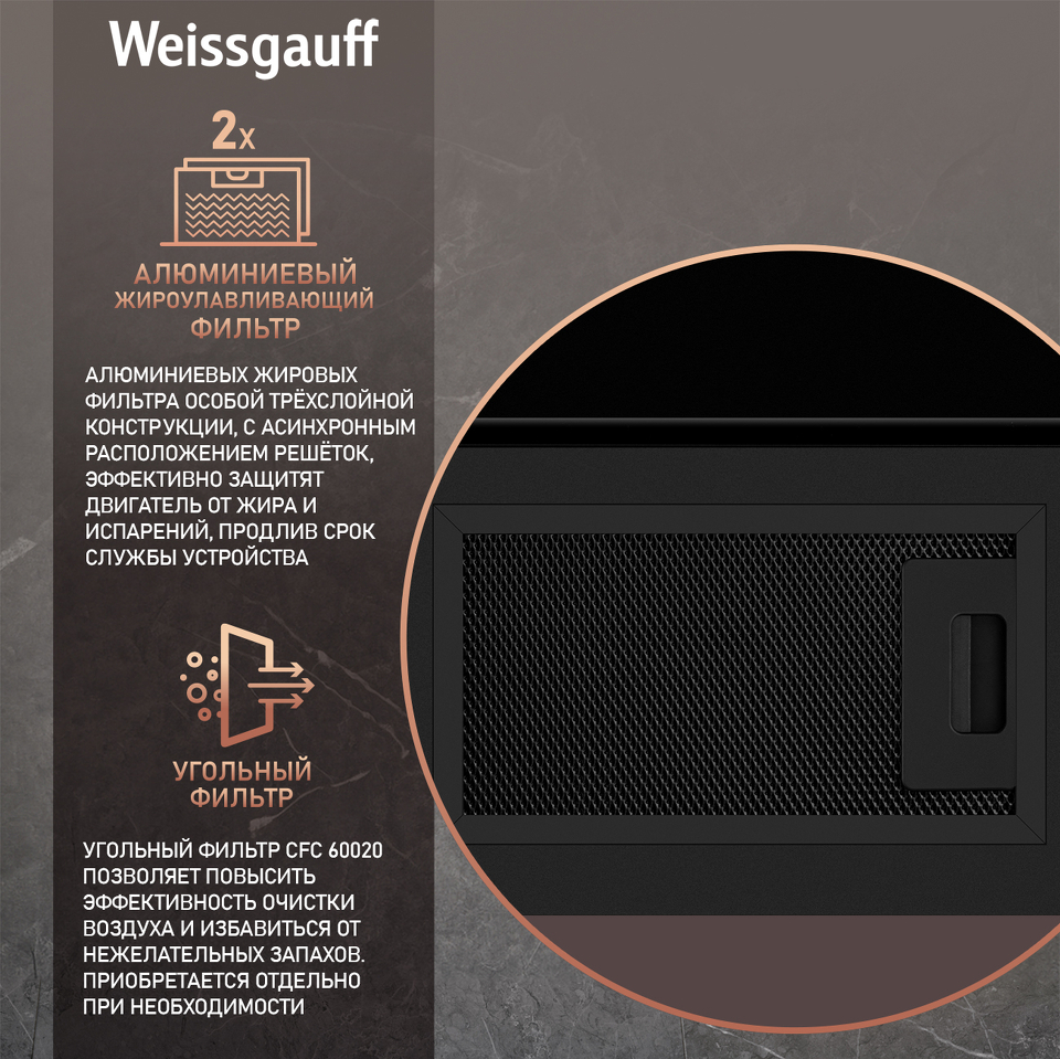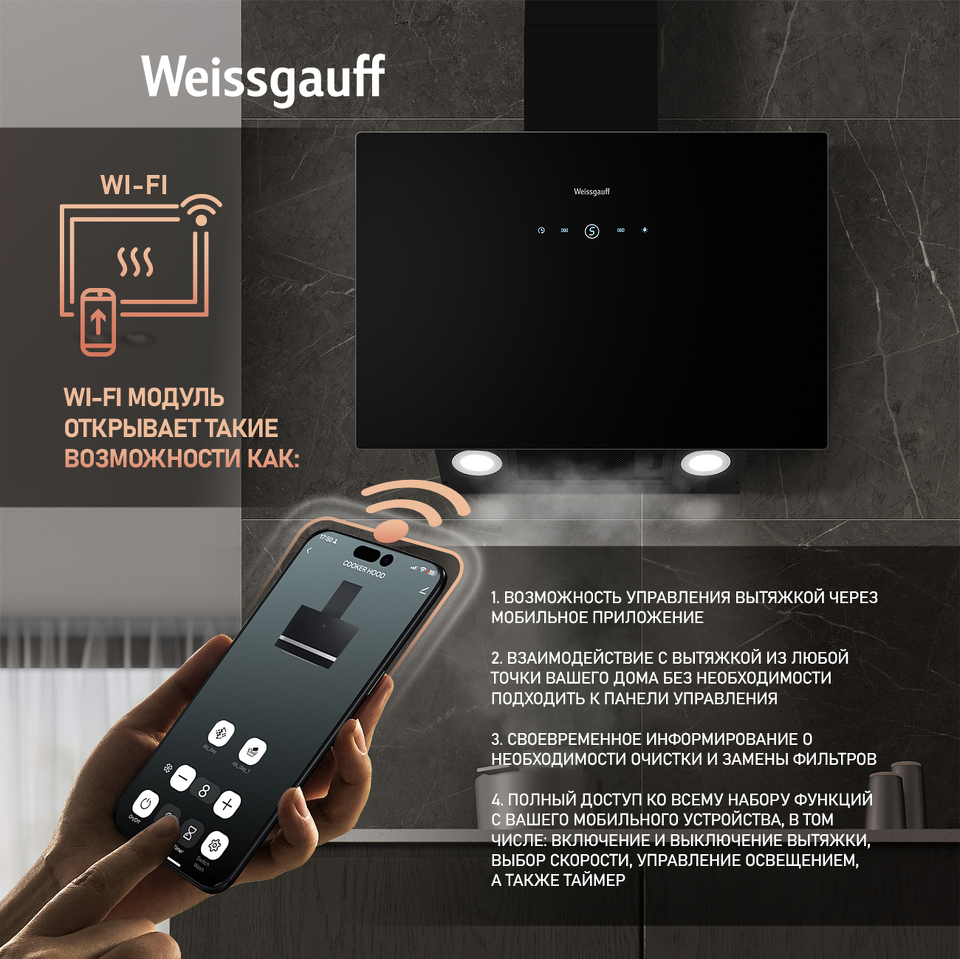 Изящная, элегантная, и при этом мощная наклонная вытяжка от Weissgauff шириной 60 см, выполненная в чёрном закаленном стекле, оснащенная инверторным двигателем, а также Wi-Fi модулем с управлением через мобильное приложение и чувствительным сенсорным управлением, станет настоящей жемчужиной в украшении интерьера вашей кухни, объединяя в себе прекрасную функциональность и великолепный дизайн!