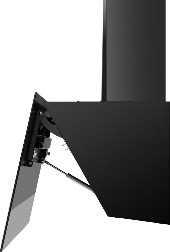 Дизайн, выполненный в черном закаленном стекле, открывает возможность гармоничного использования этой вытяжки в самых разных вариантах дизайна кухни.