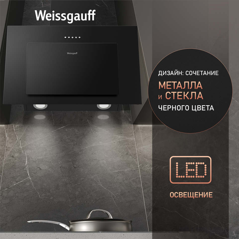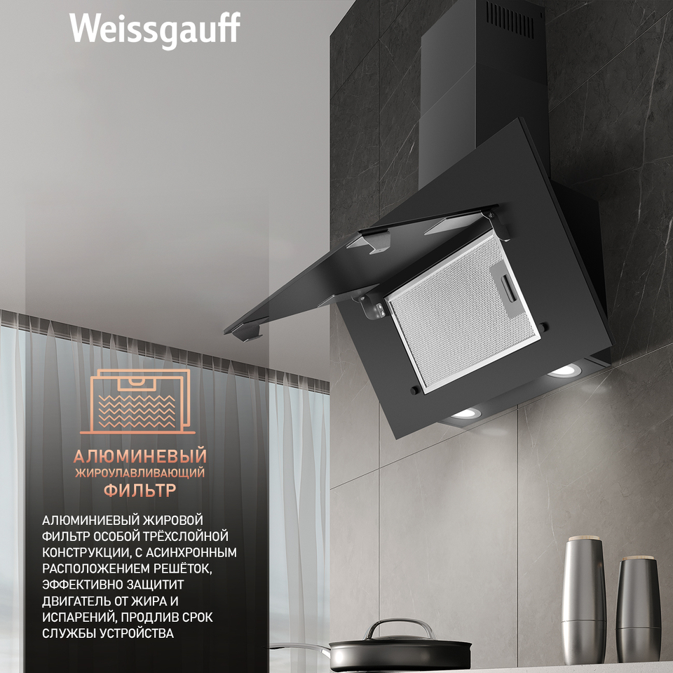Изящная, элегантная, и при этом мощная наклонная вытяжка от Weissgauff, выполненная в чёрном цвете, способная работать как в режиме отвода, так и в режиме рециркуляции, станет универсальной и стильной помощницей в интерьере вашей кухни.