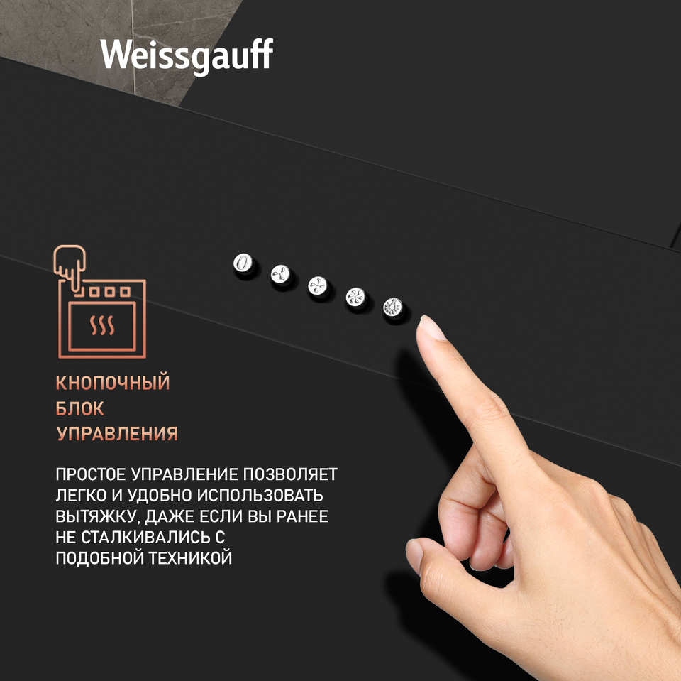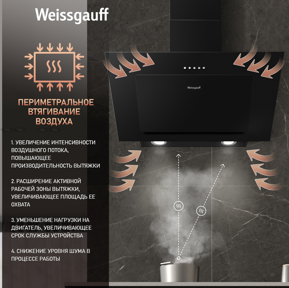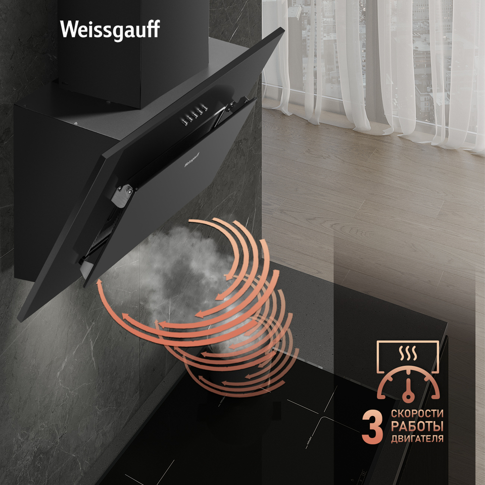 Эффективная работа в помещении площадью до 27 м2 - это гарантия того, что после установки вытяжки Weissgauff, обновление воздуха будет соответствовать всем требуемым нормам, сохраняя ваше здоровье на долгие годы!