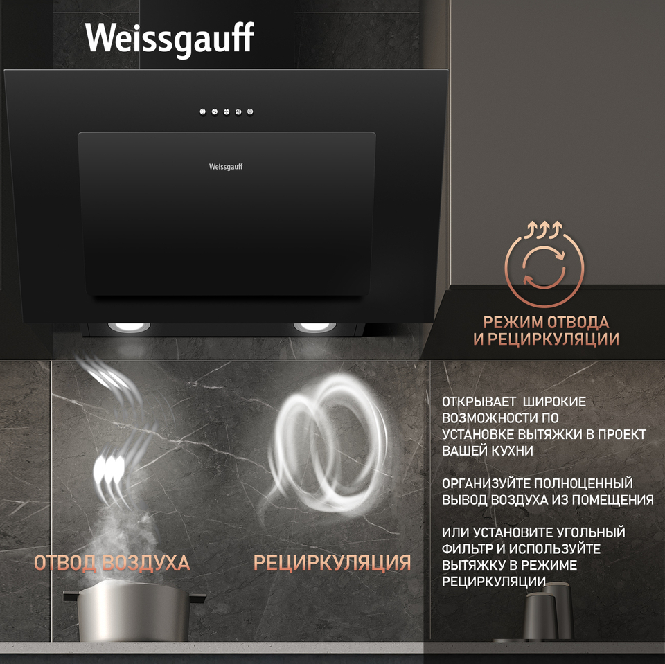 Работа в режимах отвода и циркуляции откроет вам широкие возможности по установке этой вытяжки в проект вашей кухни. Организуйте полноценный вывод воздуха из помещения или установите угольный фильтр и используйте вытяжку вместе с ним - какой бы вариант вы ни выбрали, модель от Weissgauff сделает это возможным!