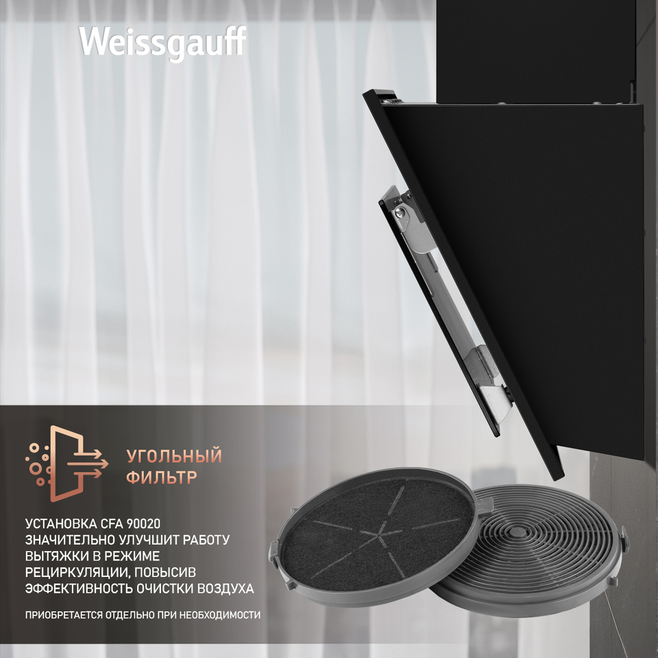 Возможность установки угольного фильтра станет отличным решением для вытяжки, работающей в режиме рециркуляции, позволяющим повысить эффективность очистки воздуха и избавиться от нежелательных запахов!