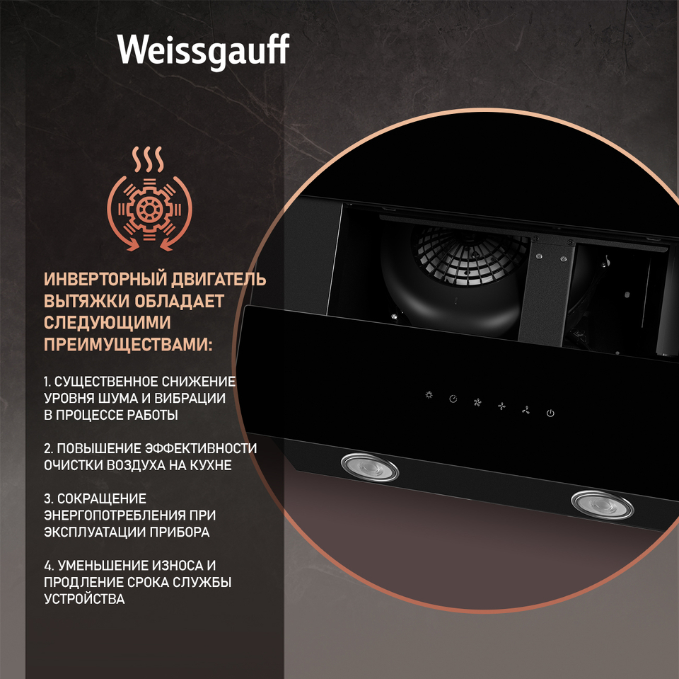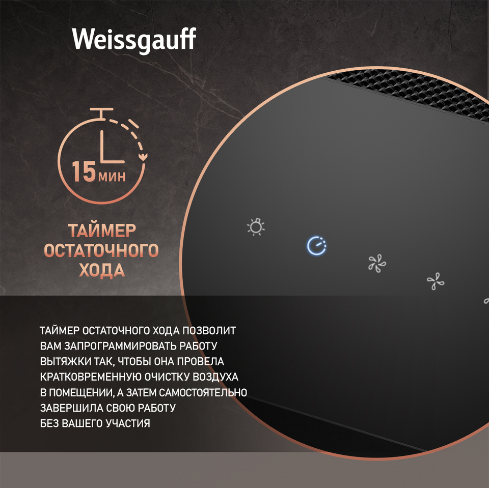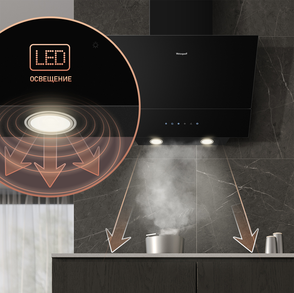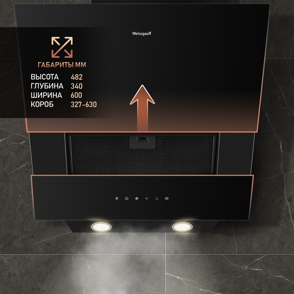 Эффективная работа в помещении площадью до 27 м2 - это гарантия того, что после установки вытяжки Weissgauff, обновление воздуха будет соответствовать всем требуемым нормам, сохраняя ваше здоровье на долгие годы!