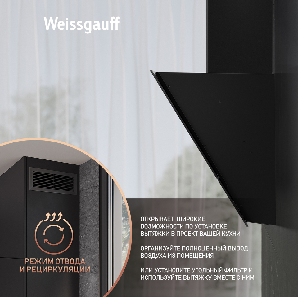 Работа в режимах отвода и циркуляции откроет вам широкие возможности по установке этой вытяжки в проект вашей кухни. Организуйте полноценный вывод воздуха из помещения или установите угольный фильтр и используйте вытяжку вместе с ним - какой бы вариант вы ни выбрали, модель от Weissgauff сделает это возможным!