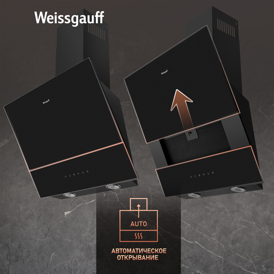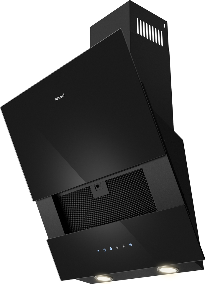 Изящная, элегантная, и при этом мощная наклонная вытяжка от Weissgauff, выполненная в чёрном цвете и оснащенная сенсорным управлением, использует в своём дизайне панель из закаленного стекла, что делает её более универсальной при использовании в интерьере кухни.