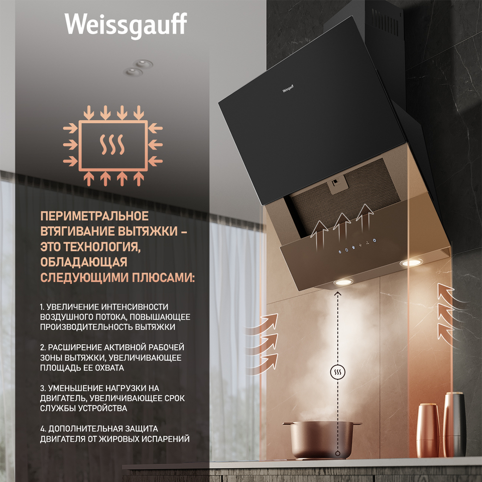 Периметральное всасывание - это технология, которая позволяет вытяжке достигать более высокой производительности, существенно снижая при этом шум.