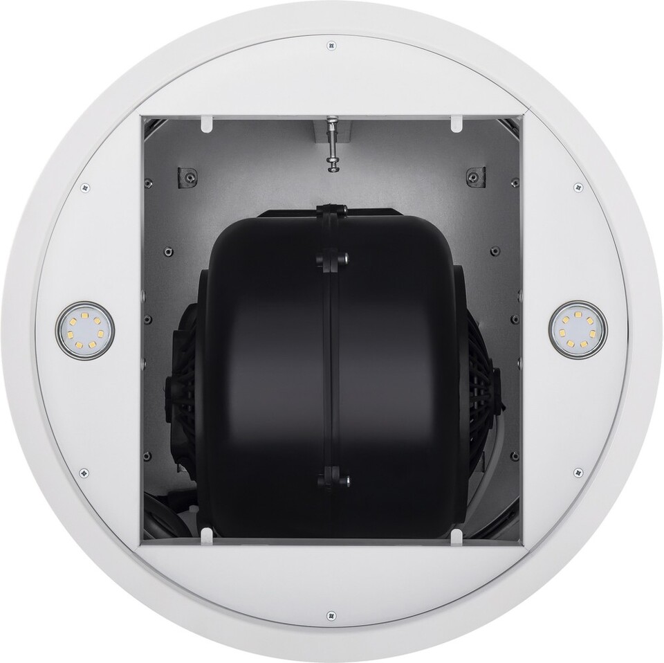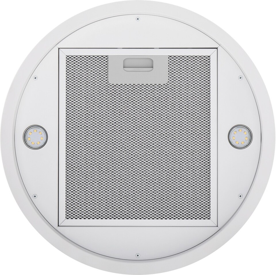 Корпус цилиндрической формы, выполненный из нержавеющей стали с термостойким покрытием белого цвета, монтируется на потолок над варочной поверхностью. В нижнем торце вытяжки расположен специальный многослойный жироулавливающий фильтр, который легко вынимается и полностью разбирается для чистки.