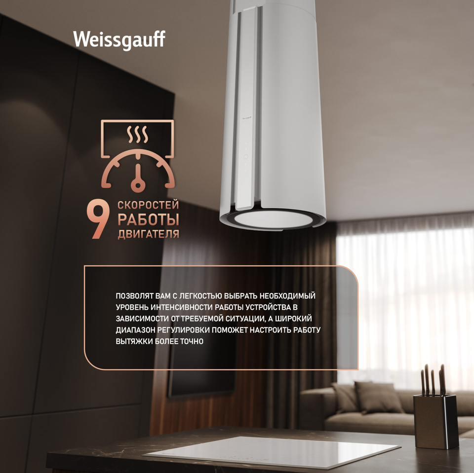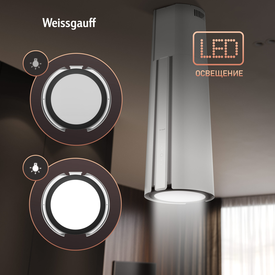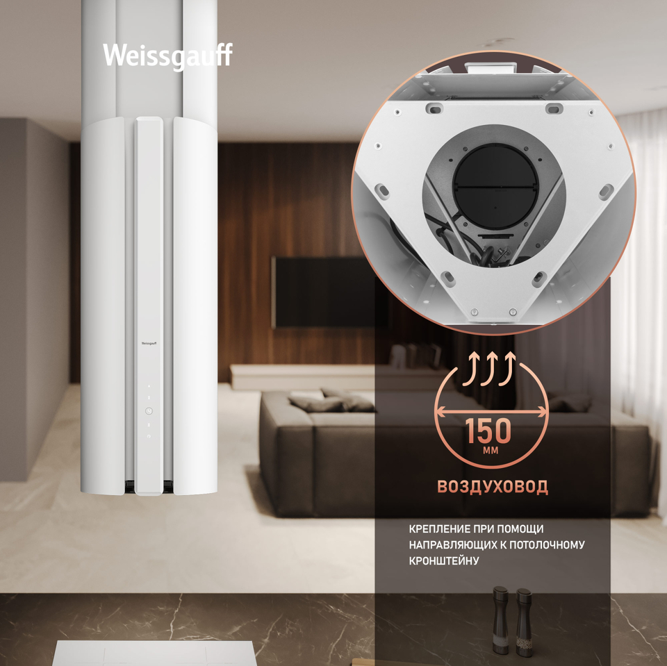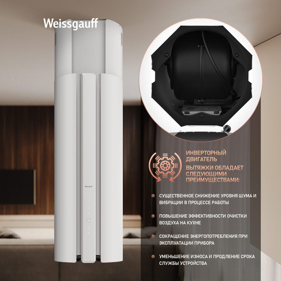 Островная вытяжка от Weissgauff с креплением на потолочном кронштейне, выполненная в белом цвете, оснащена высокоэффективным инверторным двигателем, снижающим уровень шума и повышающим производительность устройства, а также мощной лампой светодиодного освещения, призванной сделать более комфортной вашу работу на кухне!