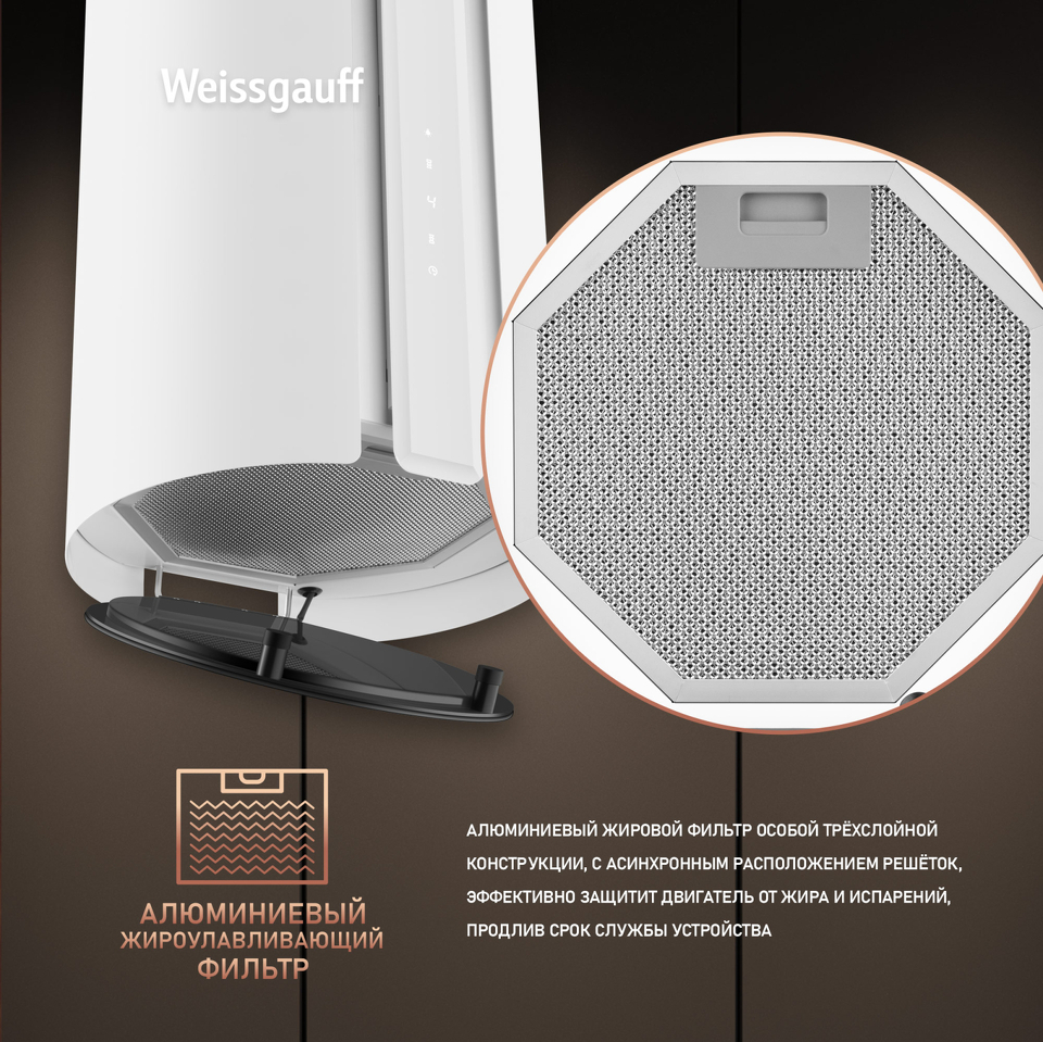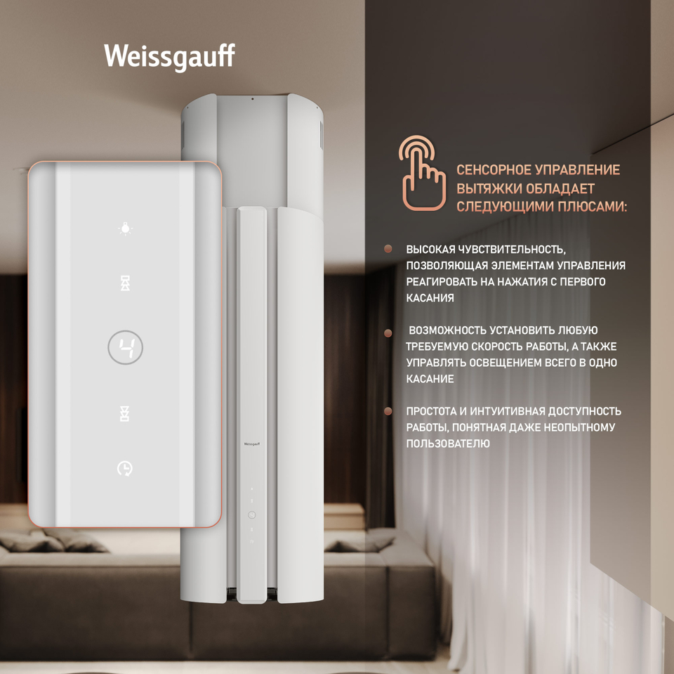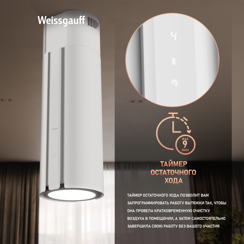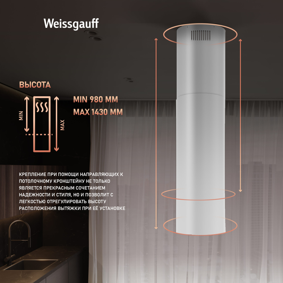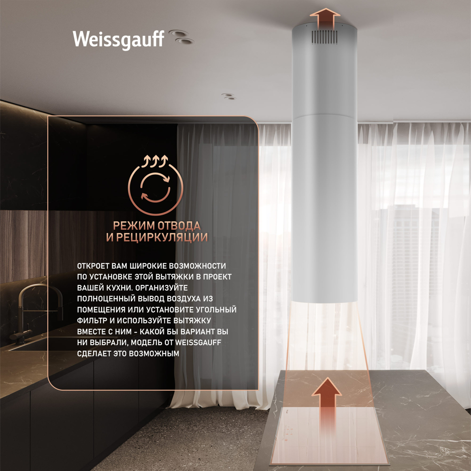 Островная вытяжка от Weissgauff с креплением на потолочном кронштейне, выполненная в белом цвете, оснащена высокоэффективным инверторным двигателем, снижающим уровень шума и повышающим производительность устройства, а также мощной лампой светодиодного освещения, призванной сделать более комфортной вашу работу на кухне!