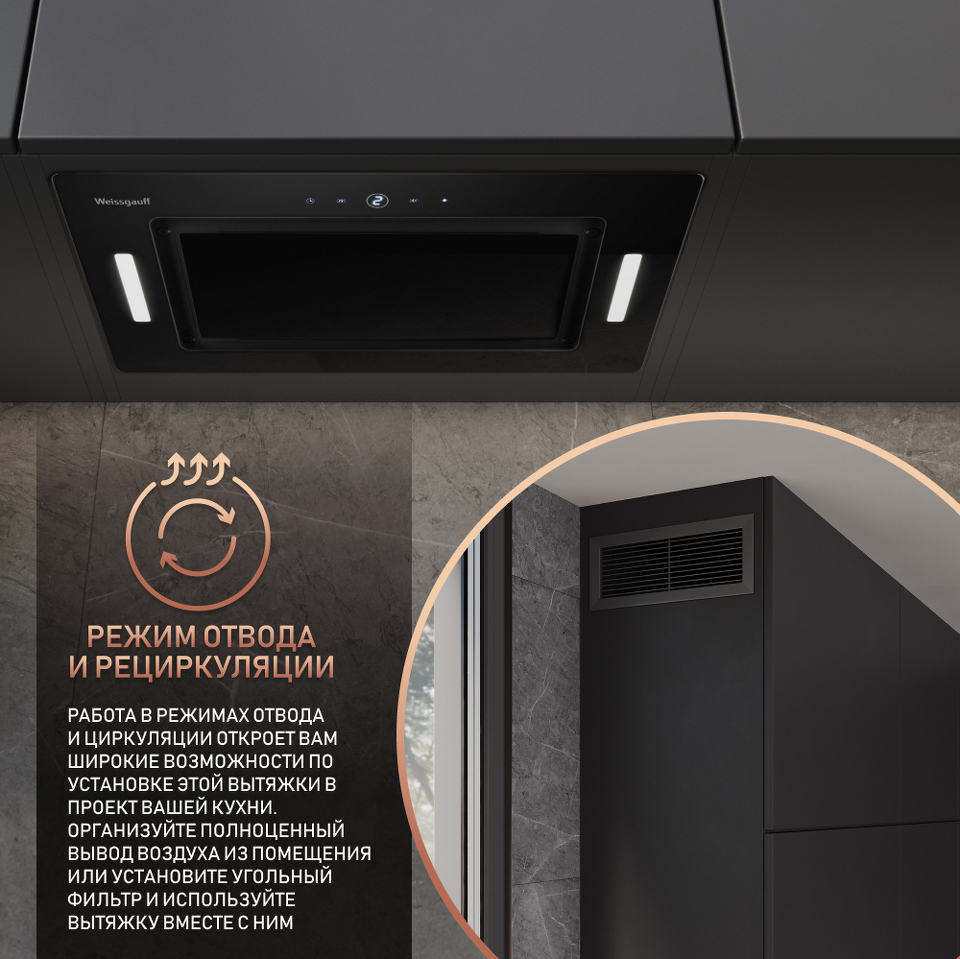 Работа в режимах отвода и циркуляции откроет вам широкие возможности по установке этой вытяжки в проект вашей кухни. Организуйте полноценный вывод воздуха из помещения или установите угольный фильтр и используйте вытяжку вместе с ним - какой бы вариант вы ни выбрали, модель от Weissgauff сделает это возможным!