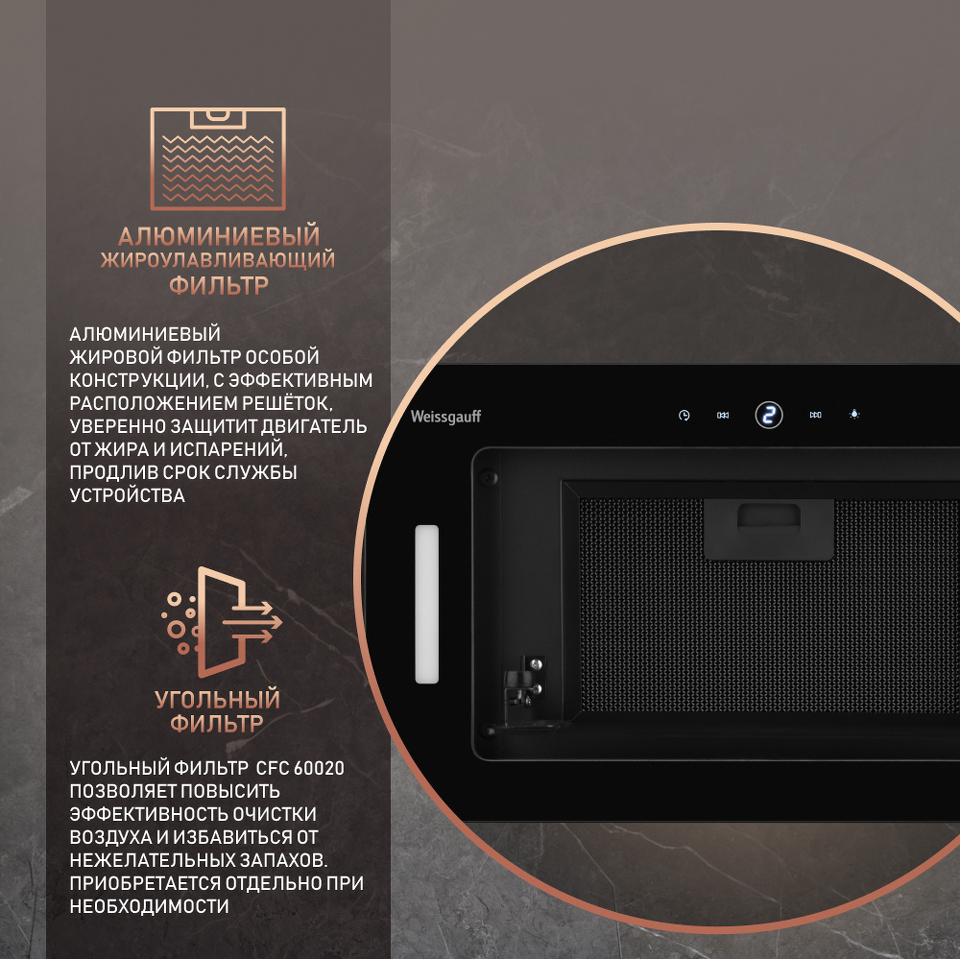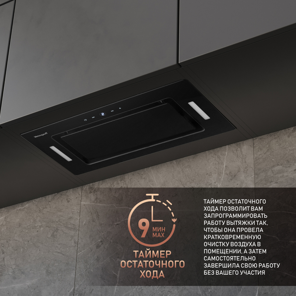 Полностью встраиваемая вытяжка от Weissgauff, выполненная в дизайне врезного блока с панелью в закаленном стекле черного цвета, оснащена инверторным двигателем, а также Wi-Fi модулем с управлением через мобильное приложение, чувствительным и отзывчивым сенсорным управлением, а также двойным STRIP LED-освещением