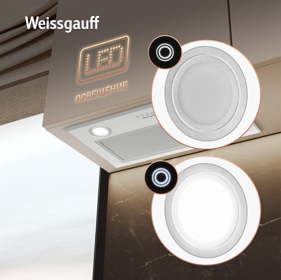 Полностью встраиваемая вытяжка от Weissgauff, воплощающая в себе безупречный дизайн и высокую эффективность, оснащена интуитивно понятным кнопочным управлением и выполнена в дизайне врезного блока с панелью стильного белого цвета!