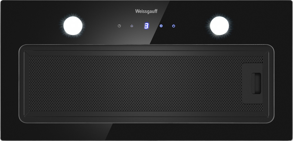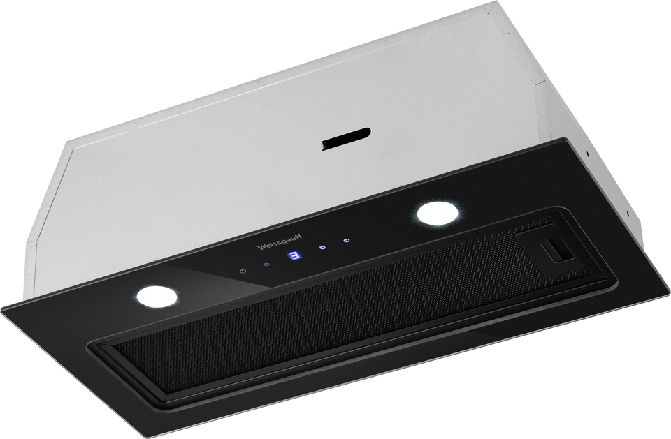 Полностью встраиваемая вытяжка от Weissgauff, выполненная в дизайне врезного блока с панелью в закаленном стекле черного цвета, оснащена чувствительным и отзывчивым сенсорным управлением, а также двойным LED-освещением