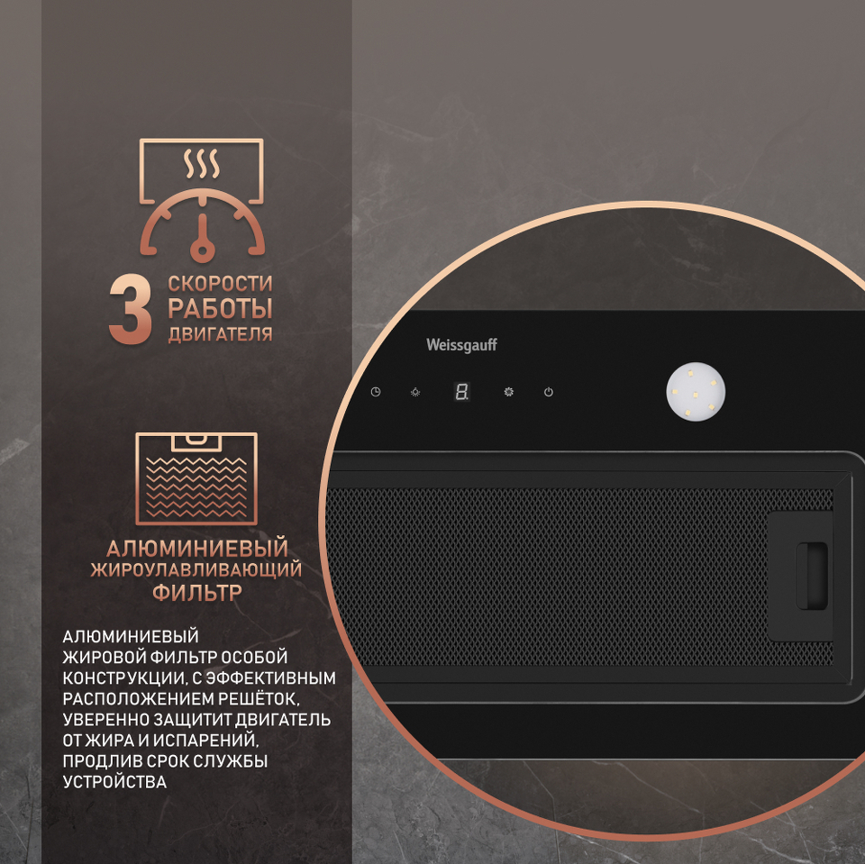 Эффективная работа в помещении площадью до 18 м2 - это гарантия того, что после установки вытяжки Weissgauff, обновление воздуха будет соответствовать всем требуемым нормам, сохраняя ваше здоровье на долгие годы!