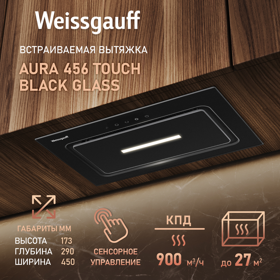 Полностью встраиваемая вытяжка от Weissgauff, воплощающая в себе безупречный дизайн и высокую эффективность, оснащена интуитивно понятным сенсорным управлением и выполнена в дизайне врезного блока с панелью стильного черного цвета!