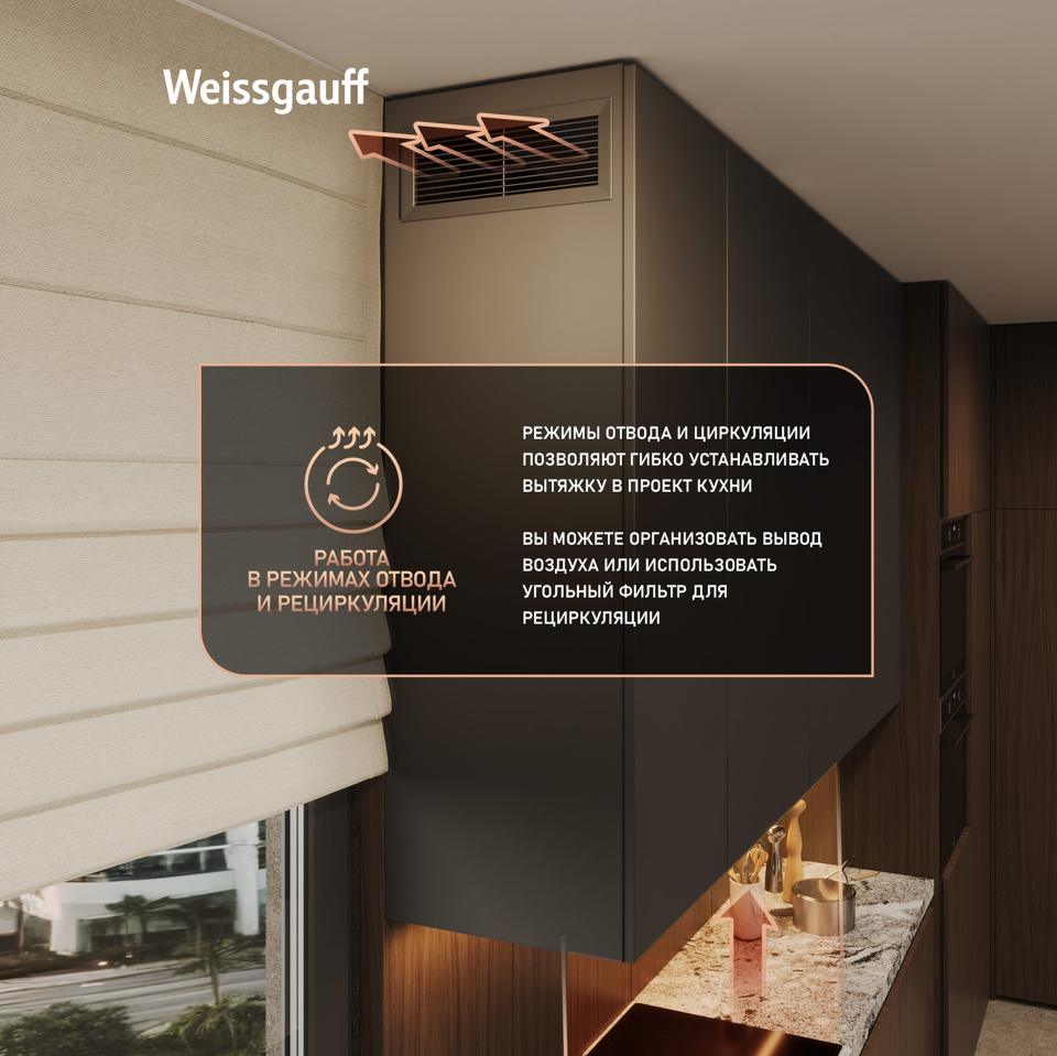 Эффективная работа в помещении площадью до 27 м2 - это гарантия того, что после установки вытяжки Weissgauff, обновление воздуха будет соответствовать всем требуемым нормам, сохраняя ваше здоровье на долгие годы!