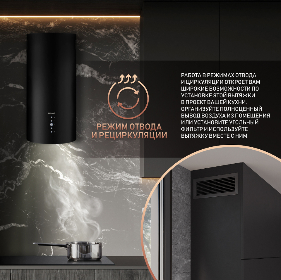 Работа в режимах отвода и циркуляции откроет вам широкие возможности по установке этой вытяжки в проект вашей кухни. Организуйте полноценный вывод воздуха из помещения или установите угольный фильтр и используйте вытяжку вместе с ним - какой бы вариант вы ни выбрали, модель от Weissgauff сделает это возможным!