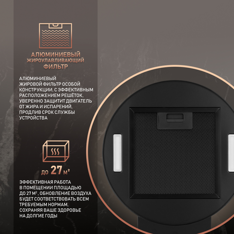 Дизайн, выполненный в черном цвете, станет финальным штрихом в совершенстве великолепного облика этой модели. Каждый раз, заходя на кухню, вы будете чувствовать, что эта вытяжка - не просто функциональное устройство, но и настоящее украшение вашей кухни!