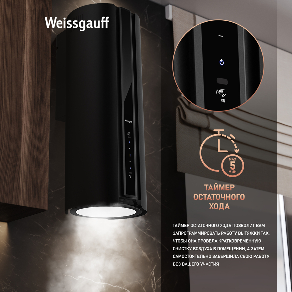 Цилиндрическая пристенная вытяжка Weissgauff, выполненная в чёрном цвете, оснащена мощным инверторным двигателем, который не только снижает уровень шума, но и повышает эффективность работы устройства. Управление осуществляется как с помощью сенсорных кнопок на корпусе, так и жестами, что значительно упрощает эксплуатацию. В дополнение к этому, мощная светодиодная лампа обеспечивает яркое освещение, делая работу на кухне более комфортной!