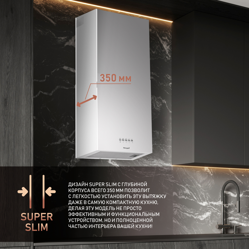 Дизайн SUPER SLIM с глубиной корпуса всего 350 мм позволит с легкостью установить эту вытяжку даже в самую компактную кухню, делая эту модель не просто эффективным и функциональным устройством, но и полноценной частью интерьера вашей кухни!