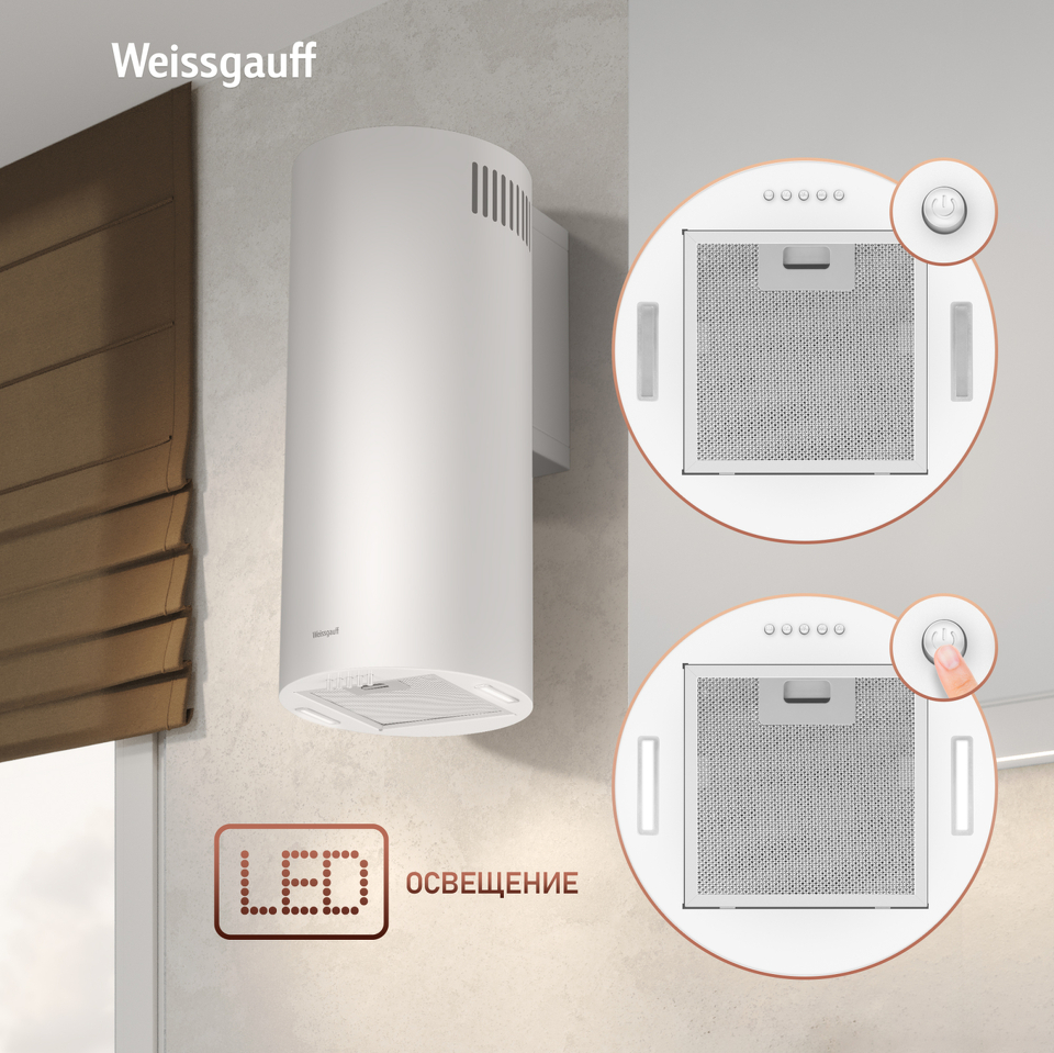 Эффективная работа в помещении площадью до 27 м2 - это гарантия того, что после установки вытяжки Weissgauff, обновление воздуха будет соответствовать всем требуемым нормам, сохраняя ваше здоровье на долгие годы!